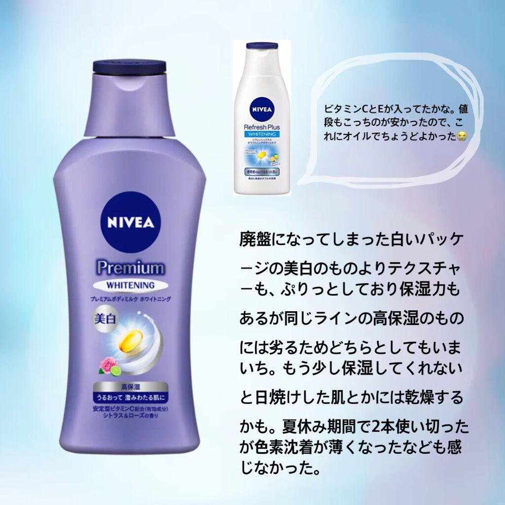 ニベアプレミアムボディミルクホワイトニング🤍結婚式に向けたボディケアに使っていました。普段はボディケアをサボりがちなのですが、背中や肌が綺麗な花嫁さんに憧れてドレスを着たときによく見える鎖骨周りや背中を中心に頑張りました💪✨️夏の前撮りで右...