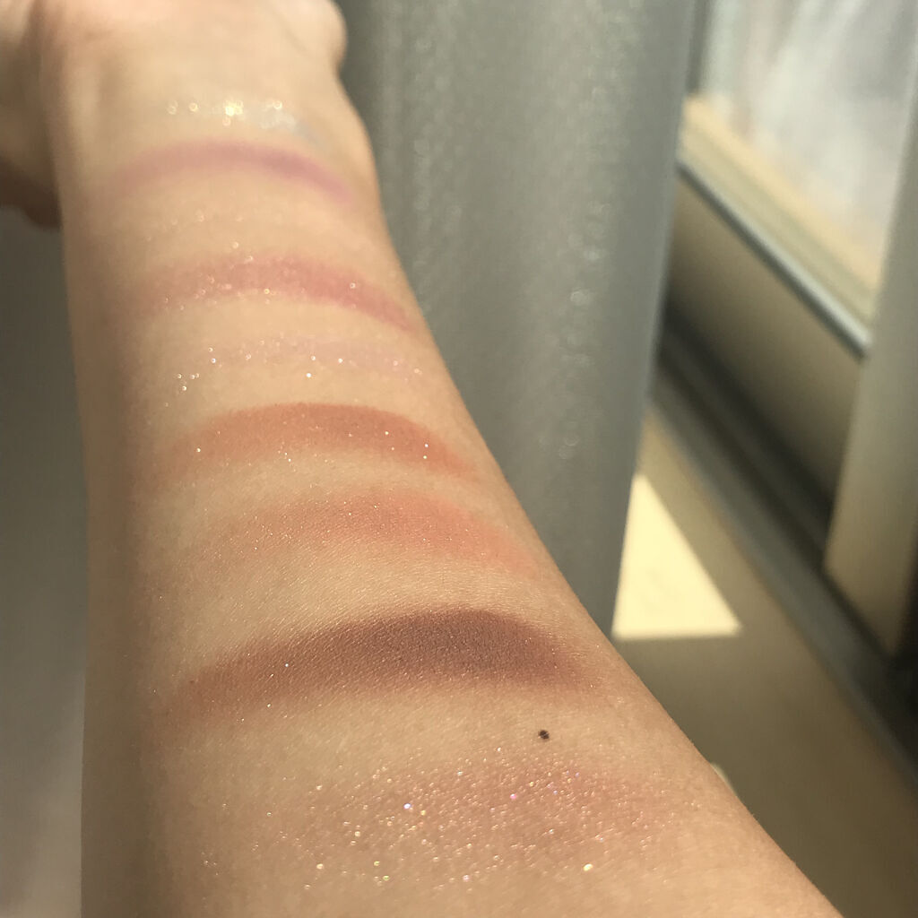 キラキラしていてとてもかわいいです!それぞれのアイシャドウもなみなみした形に固められていて、鏡&ブラシ付きなのも嬉しいですね♪ ラメはとてもキラキラしていて綺麗&色がほとんどついてないので誰でも使えます! 固めなのでブラシでとるとあまり発色しませんでした、!なのでスウォッチも指でぐりぐりとってます笑笑