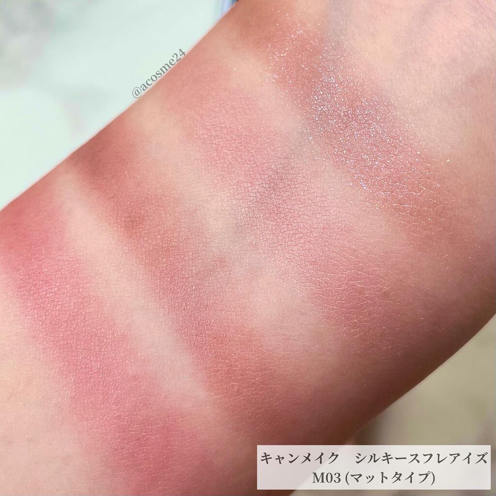 キャンメイクシルキースフレアイズマットタイプM04キューピッドペタル¥825◇質感(マット3、小粒ラメ1)質感はマットですがふわっとしていて透け感があるので色を重ねても重くなったり濁ったりしないのが特徴です◎ラメは小粒ですが思った以上にキラッ...