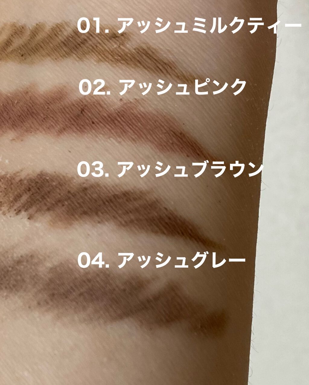 - <01 アッシュミルクティー> ベヘン酸、モクロウ、トリエチルヘキサノイン、ダイマージリノール酸(フィトステリル/イソステアリル/セチル/ステアリル/ベヘニル)、トリ酢酸テトラステアリン酸スクロース、水添ヒマシ油、セスキイソステアリン酸ソルビタン、スクワラン、ラウロイルリシン、水酸化Al、トコフェロール、シリカ、セルロース、マイカ、酸化鉄、酸化チタン <02 アッシュピンク> ベヘン酸、モクロウ、トリエチルヘキサノイン、ダイマージリノール酸(フィトステリル/イソステアリル/セチル/ステアリル/ベヘニル)、トリ酢酸テトラステアリン酸スクロース、水添ヒマシ油、セスキイソステアリン酸ソルビタン、スクワラン、ラウロイルリシン、水酸化Al、トコフェロール、シリカ、セルロース、マイカ、酸化鉄、酸化チタン <03 アッシュブラウン> ベヘン酸、モクロウ、トリエチルヘキサノイン、ダイマージリノール酸(フィトステリル/イソステアリル/セチル/ステアリル/ベヘニル)、トリ酢酸テトラステアリン酸スクロース、水添ヒマシ油、セスキイソステアリン酸ソルビタン、スクワラン、ラウロイルリシン、水酸化Al、トコフェロール、シリカ、セルロース、マイカ、酸化鉄、酸化チタン <04 アッシュグレー> ベヘン酸、モクロウ、トリエチルヘキサノイン、ダイマージリノール酸(フィトステリル/イソステアリル/セチル/ステアリル/ベヘニル)、トリ酢酸テトラステアリン酸スクロース、水添ヒマシ油、セスキイソステアリン酸ソルビタン、スクワラン、ラウロイルリシン、水酸化Al、トコフェロール、シリカ、セルロース、マイカ、酸化鉄、酸化チタン <05 アッシュオリーブ> ベヘン酸、モクロウ、トリエチルヘキサノイン、ダイマージリノール酸(フィトステリル/イソステアリル/セチル/ステアリル/ベヘニル)、トリ酢酸テトラステアリン酸スクロース、水添ヒマシ油、セスキイソステアリン酸ソルビタン、スクワラン、ラウロイルリシン、水酸化Al、トコフェロール、シリカ、セルロース、マイカ、酸化鉄、酸化チタン