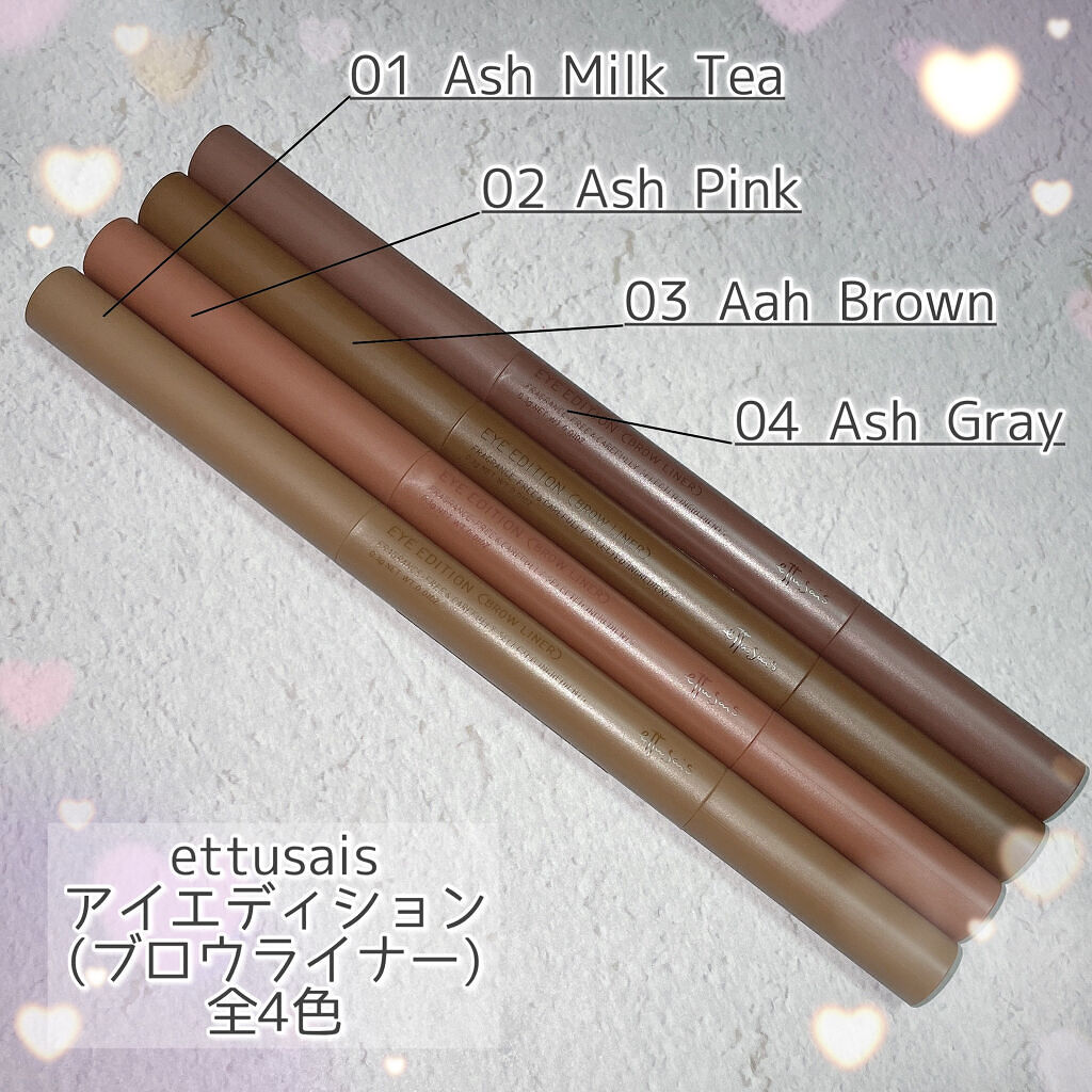 - <01 アッシュミルクティー> ベヘン酸、モクロウ、トリエチルヘキサノイン、ダイマージリノール酸(フィトステリル/イソステアリル/セチル/ステアリル/ベヘニル)、トリ酢酸テトラステアリン酸スクロース、水添ヒマシ油、セスキイソステアリン酸ソルビタン、スクワラン、ラウロイルリシン、水酸化Al、トコフェロール、シリカ、セルロース、マイカ、酸化鉄、酸化チタン <02 アッシュピンク> ベヘン酸、モクロウ、トリエチルヘキサノイン、ダイマージリノール酸(フィトステリル/イソステアリル/セチル/ステアリル/ベヘニル)、トリ酢酸テトラステアリン酸スクロース、水添ヒマシ油、セスキイソステアリン酸ソルビタン、スクワラン、ラウロイルリシン、水酸化Al、トコフェロール、シリカ、セルロース、マイカ、酸化鉄、酸化チタン <03 アッシュブラウン> ベヘン酸、モクロウ、トリエチルヘキサノイン、ダイマージリノール酸(フィトステリル/イソステアリル/セチル/ステアリル/ベヘニル)、トリ酢酸テトラステアリン酸スクロース、水添ヒマシ油、セスキイソステアリン酸ソルビタン、スクワラン、ラウロイルリシン、水酸化Al、トコフェロール、シリカ、セルロース、マイカ、酸化鉄、酸化チタン <04 アッシュグレー> ベヘン酸、モクロウ、トリエチルヘキサノイン、ダイマージリノール酸(フィトステリル/イソステアリル/セチル/ステアリル/ベヘニル)、トリ酢酸テトラステアリン酸スクロース、水添ヒマシ油、セスキイソステアリン酸ソルビタン、スクワラン、ラウロイルリシン、水酸化Al、トコフェロール、シリカ、セルロース、マイカ、酸化鉄、酸化チタン <05 アッシュオリーブ> ベヘン酸、モクロウ、トリエチルヘキサノイン、ダイマージリノール酸(フィトステリル/イソステアリル/セチル/ステアリル/ベヘニル)、トリ酢酸テトラステアリン酸スクロース、水添ヒマシ油、セスキイソステアリン酸ソルビタン、スクワラン、ラウロイルリシン、水酸化Al、トコフェロール、シリカ、セルロース、マイカ、酸化鉄、酸化チタン