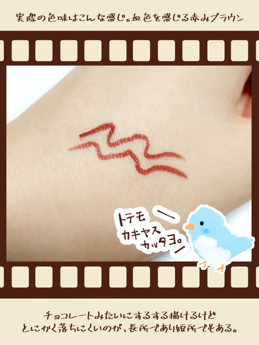 やわらかくてするする描ける ・肌馴染み◎ ・しっかり発色 ・びっくりするほど落ちにくい バズってた色ってガーネットバーガンディだったっけな?と思い、とりあえず買ってみました。 店頭でテスターを軽率に手の甲に描くと強めに擦っても落ちないので注意です⚠️