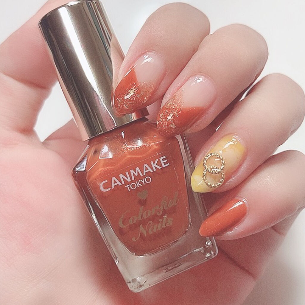 オレンジの誘惑に負けた🧡😍可愛すぎる!!ちふれのオレンジラメ🧡ちふれネイルエナメル017カラフルラメ可愛い、、マジで可愛すぎて夢中で塗ってたら、グラデーションしか出来なかった(笑)オレンジの微細なラメに、大きめゴールドのホロ⭐️塗るとシアーな...