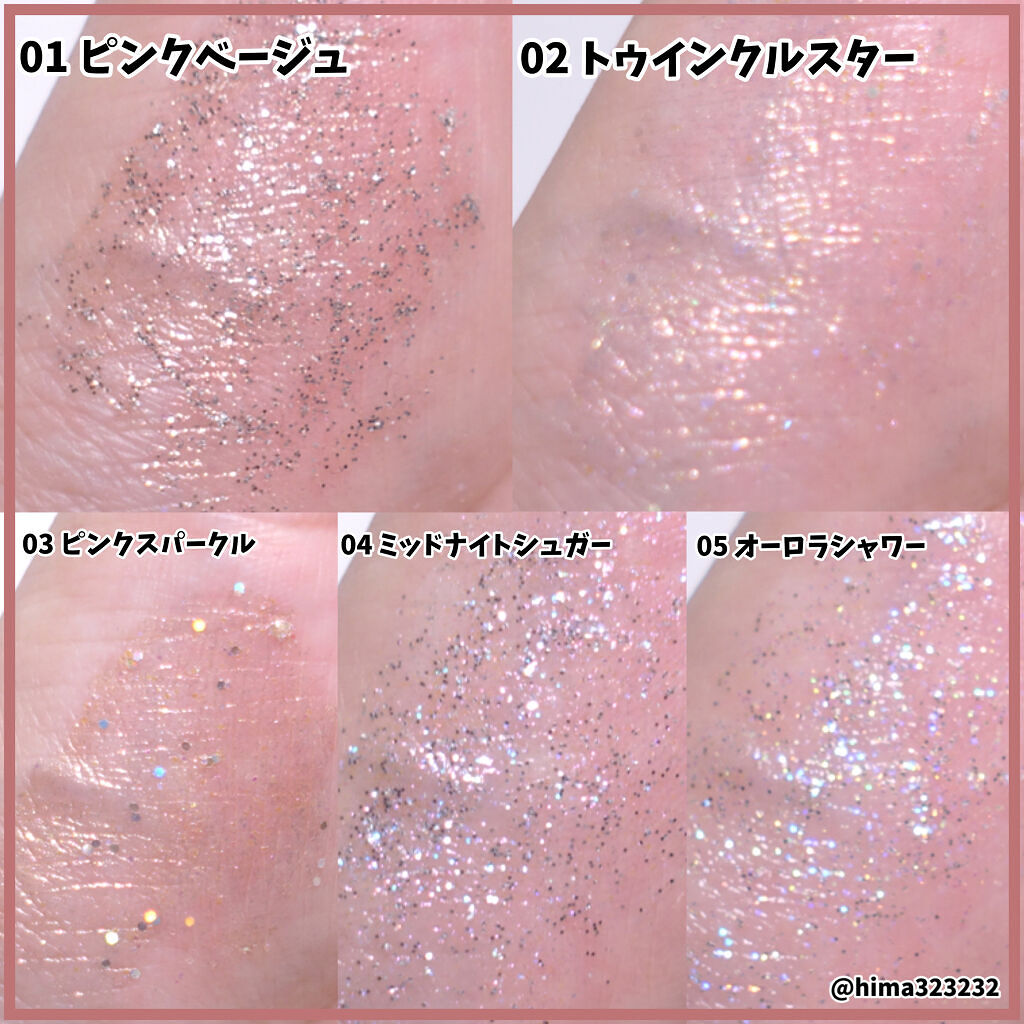 このシリーズ、人気すぎて店頭から消えてたんですが最近リニューアルしてまた復活してます^_^ 大小色々なラメやパープルやグリーンにも見えるラメにベースはピンクで馴染みやすく自然光でもしっかり煌めきを主張してくれます💕 テクスチャの伸びはよくて塗りやすいのに乾きやすいしヨレないのもありがたい😭