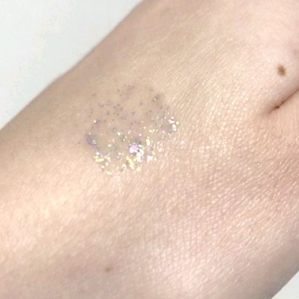 お値段は一つ300円。破格ですね。 色は06のプラネットシャドウと03のエメラルドティアーズを購入しました。 06のプラネットシャドウは濃い青色をしたグリッターになっています。手に塗ってみると青ラメとスパンコールがぎっしり入っていてまさに宇宙という感じがしました。 こちらのグリッター思ったよりべったりくっつくことはなく、ほんの少ししかつかないので涙袋など細かいところに塗るのにちょうど良いです。