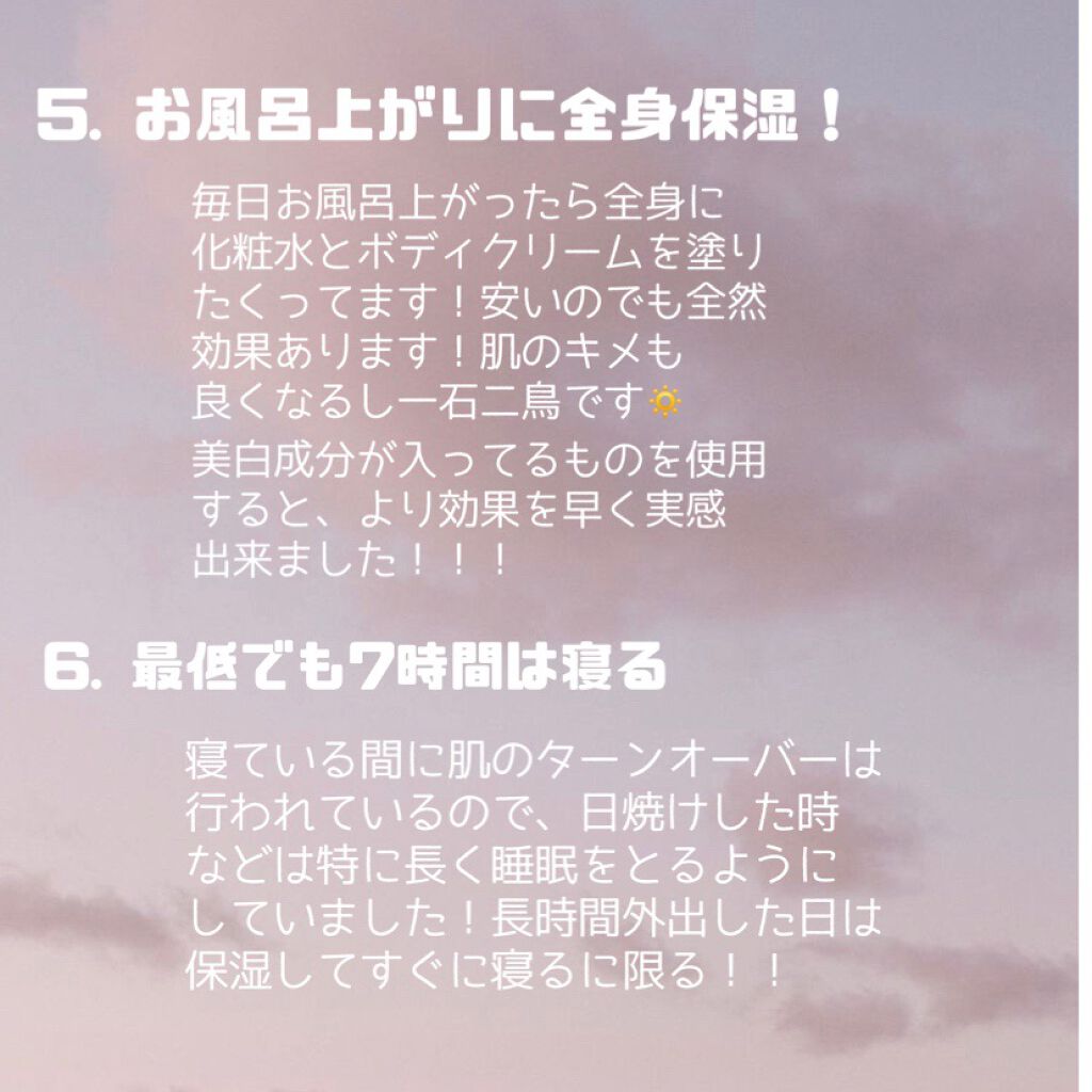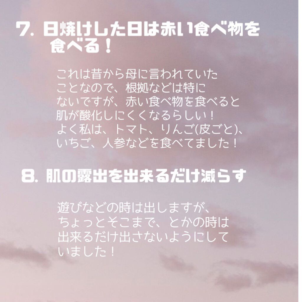 こんなに真っ黒だった私でも人並みに白くなれたので、きっと効果あると思います! ビオレUV マイルドケアミルク SPF30 スキンアクア トーンアップUVエッセンス アリィー ニュアンスチェンジUV ジェル WT ロート製薬のヘリオホワイト 内側が黒のものがおすすめ! ハトムギ化粧水 ジョンソン・エンド・ジョンソンラスティングモイスチャーアロマミルク ダイアン ハニーオランジュの香り/ボディミルク ブルーライトをカット! 赤い食べ物は抗酸化作用があるらしいです! 日焼けした際食べたらいいらしいです! 日焼け止め 美白ケア