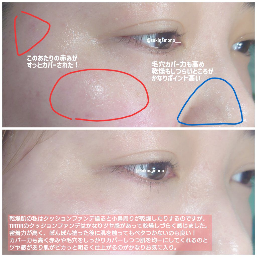 脂性肌の方におすすめ。 長時間メイクキープ。高いカバー力とさらっとした仕上がりが欲しい方へ! TIRTIRのクッションの中ではこのピンクのタイプはマットみたいですが少しツヤ感もあるように思いました✨ 日焼け止めとこのクッションのみでしたが崩れもほとんどなかった👍✨