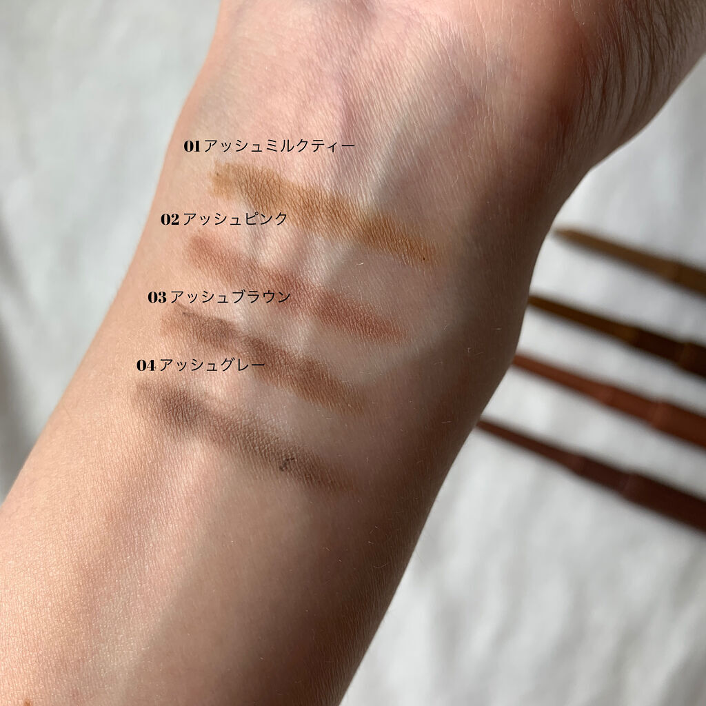 - <01 アッシュミルクティー> ベヘン酸、モクロウ、トリエチルヘキサノイン、ダイマージリノール酸(フィトステリル/イソステアリル/セチル/ステアリル/ベヘニル)、トリ酢酸テトラステアリン酸スクロース、水添ヒマシ油、セスキイソステアリン酸ソルビタン、スクワラン、ラウロイルリシン、水酸化Al、トコフェロール、シリカ、セルロース、マイカ、酸化鉄、酸化チタン <02 アッシュピンク> ベヘン酸、モクロウ、トリエチルヘキサノイン、ダイマージリノール酸(フィトステリル/イソステアリル/セチル/ステアリル/ベヘニル)、トリ酢酸テトラステアリン酸スクロース、水添ヒマシ油、セスキイソステアリン酸ソルビタン、スクワラン、ラウロイルリシン、水酸化Al、トコフェロール、シリカ、セルロース、マイカ、酸化鉄、酸化チタン <03 アッシュブラウン> ベヘン酸、モクロウ、トリエチルヘキサノイン、ダイマージリノール酸(フィトステリル/イソステアリル/セチル/ステアリル/ベヘニル)、トリ酢酸テトラステアリン酸スクロース、水添ヒマシ油、セスキイソステアリン酸ソルビタン、スクワラン、ラウロイルリシン、水酸化Al、トコフェロール、シリカ、セルロース、マイカ、酸化鉄、酸化チタン <04 アッシュグレー> ベヘン酸、モクロウ、トリエチルヘキサノイン、ダイマージリノール酸(フィトステリル/イソステアリル/セチル/ステアリル/ベヘニル)、トリ酢酸テトラステアリン酸スクロース、水添ヒマシ油、セスキイソステアリン酸ソルビタン、スクワラン、ラウロイルリシン、水酸化Al、トコフェロール、シリカ、セルロース、マイカ、酸化鉄、酸化チタン <05 アッシュオリーブ> ベヘン酸、モクロウ、トリエチルヘキサノイン、ダイマージリノール酸(フィトステリル/イソステアリル/セチル/ステアリル/ベヘニル)、トリ酢酸テトラステアリン酸スクロース、水添ヒマシ油、セスキイソステアリン酸ソルビタン、スクワラン、ラウロイルリシン、水酸化Al、トコフェロール、シリカ、セルロース、マイカ、酸化鉄、酸化チタン