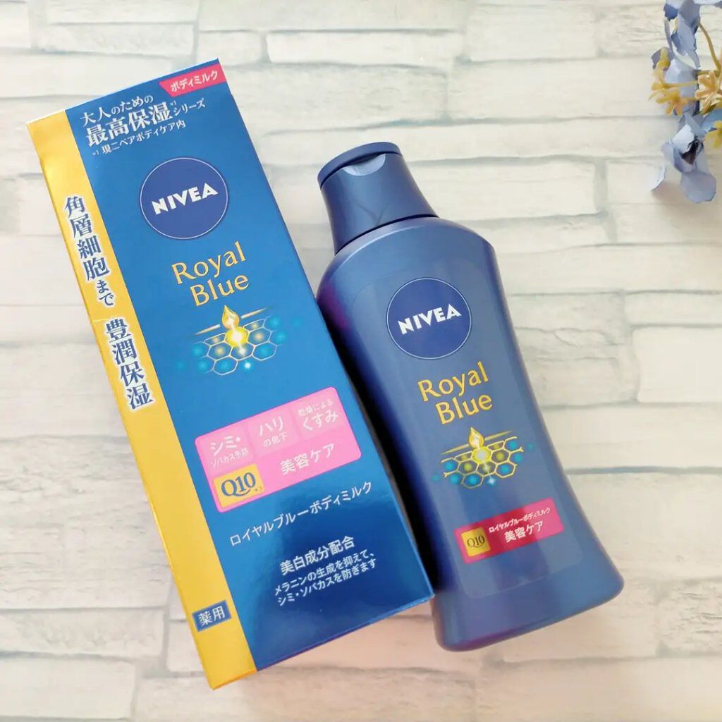 ロイヤルと名前がついているだけあって、高級感があり、ニベアのシリーズでもワンランク上の印象です✨ ベタつかないのに、高保湿なので、ふくらはぎなんかも、恥ずかしながら乾燥がひどく粉をふいたりしてたのも、しっとりとした肌になりました! 角層うるおい成分にセラミド、美白成分にビタミンC誘導体配合、コエンザイムQ10、ヒアルロン酸も配合されているので、シミ、そばかすの予防や、ハリの低下、乾燥によるくすみが気になる方などにもぜひ使ってもらいたいです✨