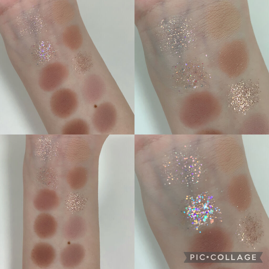 可愛すぎるコラボコスメ、メガ割初日から狙ってて届いたので早速レビュー🫶🏻💕 色味は全体的に黄み強めで、暖かみを感じる配色!マット、ちらちらパール、ぎっしりラメなど一つで何回も美味しいパレット🎨 特に目元拡大版のラメを見て欲しいんだけど、ピンク・ゴールド・シルバーのぎっしりラメ可愛すぎんか⁈🤩