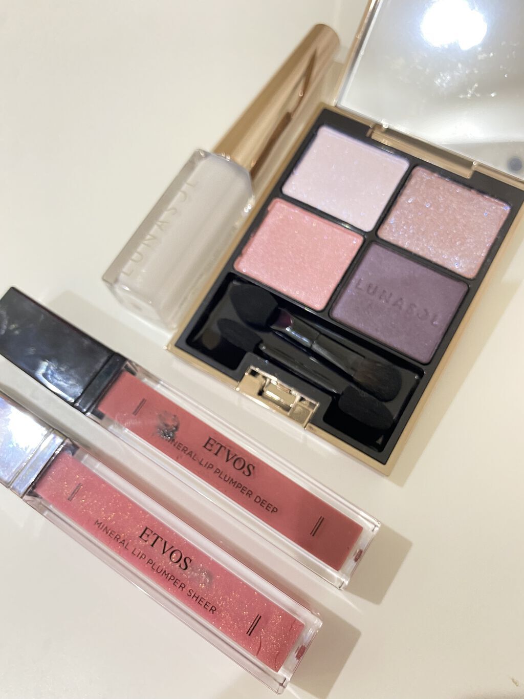 アイカラーレーションEX18を使うときは、フラッシュクリエイターEX07(または、それにちかいもの)を足すのを強くおすすめします♬ 下瞼にキラキララインが入ると一気に仕上がります。 このパレットは光で締めます✨ リップの限定色は買わずに、エトヴォスのダスティピンク・アメジストモーヴをあわせました。 唇の真ん中だけにラメを重ねても可愛い⸝⸝ᵕ ᵕ⸝⸝