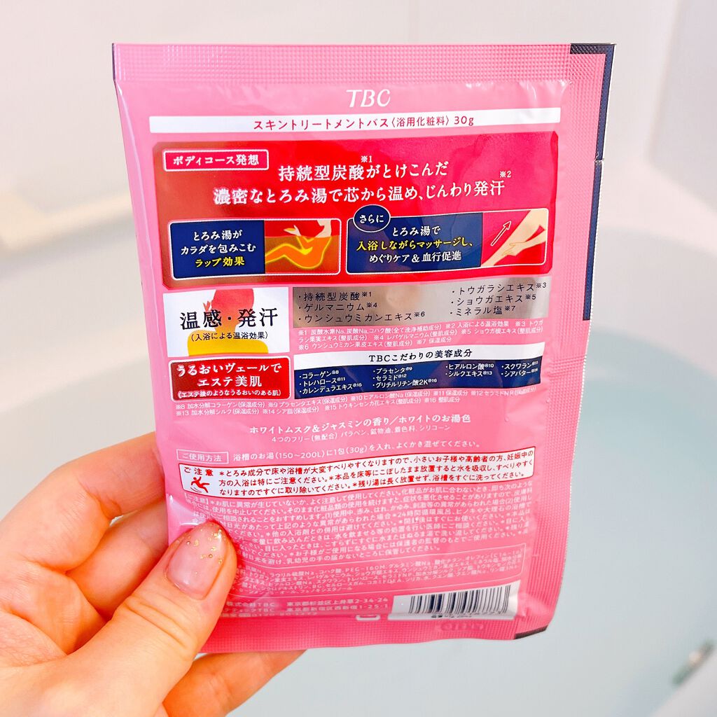 - お風呂のお湯が、全身を温かく包みこむ「とろみ美容液」のように。とろみ湯で美肌ケア+入浴による温浴効果で発汗&代謝サポート。 ①TBCエステティックコース使用厳選美容成分配合 ②TBCボディコースの理論を基に開発 ③入浴効果サポート成分配合