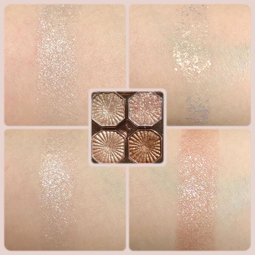 - 4色のアイシャドウを重ねるだけで理想のグラデーションが手軽に完成。深みを与えるマットや上品な艶めきをプラスするシマー、華やかなラメを組み合わせれば、こなれ感とナチュラルさを持ち合わせた目元に。シャンデリアのように華やかなグリッターやラメをのせて、毎日のメイクをもっとスペシャルに!
