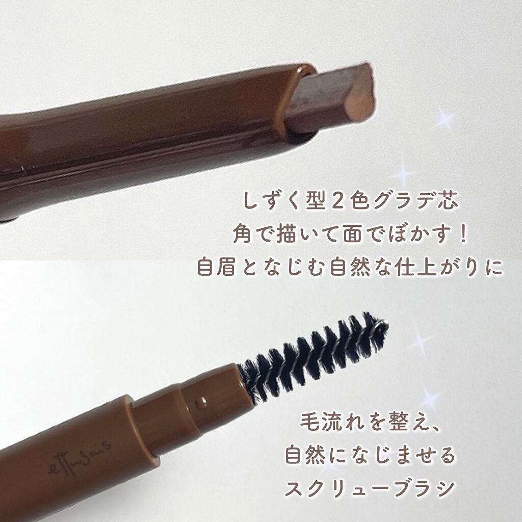 - 描き足しながらぼかせる。 ペンシルとパウダーを一つの芯にまとめた 2層芯アイブロウ ●しずく型2色グラデ芯で、自眉となじむ自然な仕上がり ー角の濃いカラーで、1本1本毛を描き足せるような細いラインを実現 ー面の淡いカラーで、自然にぼかしたような仕上がりを実現 ●毛流れを整え、自然になじませるスクリューブラシつき ●ウォータープルーフ処方 ●汗、皮脂、こすれに強く、美しい仕上がりが長時間持続 ●トリートメント成分配合 ースクワラン ●無香料 ●アレルギーテスト済(すべての方にアレルギーが起きないというわけではありません) <使い方> ●芯を2mm程度繰り出してお使いください。 ●芯の角で眉毛を1本1本描き足し、眉頭や輪郭は芯の面の部分でなじませるようにぼかします。 ●芯の出しすぎや落下などの衝撃により折れることがありますのでご注意ください。 ●ご使用後は、芯をもとにくり戻しキャップをきちんとしめてください。 ●ブラシはいつも清潔にしてお使いください。 ●日のあたるところや高温のところにおかないでください。 ●まれに芯の表面に白い粉のようなものがみられますが、品質上問題はありません。