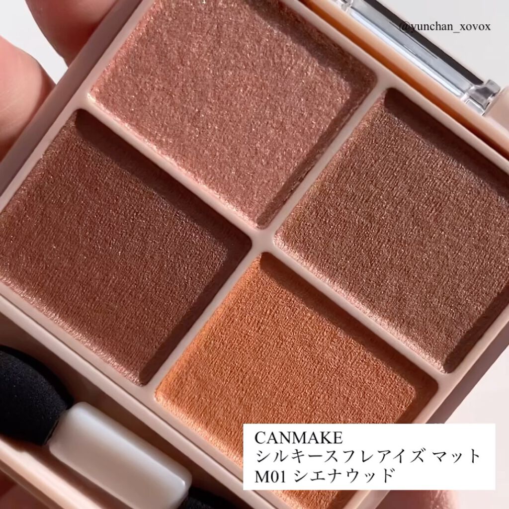 - シルキースフレアイズの姉妹品♡ 肌に溶け込むような透けマットシャドウ 透け感のある柔らかい仕上がりになるマット3色と、透け発色の繊細ラメ1色のパレットシャドウ♡ 完全マットアイや、ラメ×マットアイなど、メイクのパターンを楽しみましょう!
