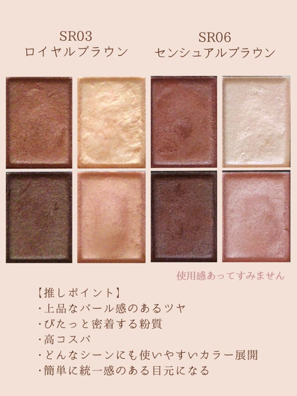- 【ポイント】 1.失敗しらずのブラウンベースの4色パレット!簡単にグラデーションを実現。 2.しっとりリッチな質感!するする伸びて粉飛びもなく目元の乾燥も防ぎます。 3.上品な輝きの繊維パール+金パールを贅沢に配合。ギラつかない大人のツヤを演出。 <SR01'23・SR03'23・SR06'23・SR11'23(限定デザイン)> 実力派グラデアイシャドウからデジタルアートをあしらった限定デザイン登場。 しっとりリッチな密着感。肌のなじみの良い実力派グラデアイシャドウ。