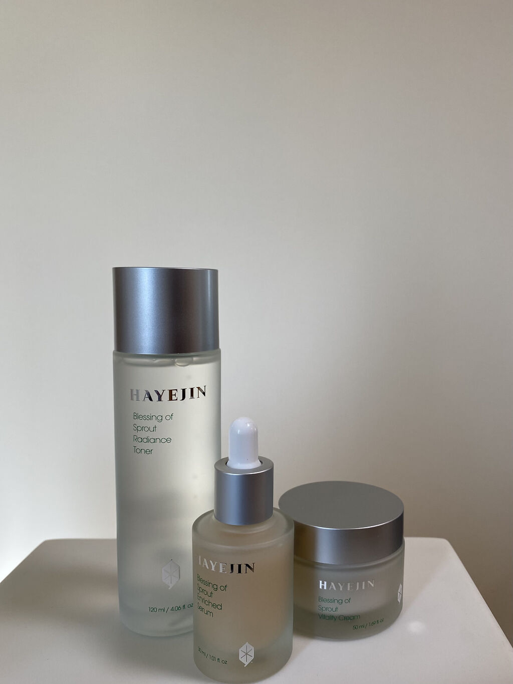 マスク荒れ改善【韓国skincare】しっとりもちもち保湿系✨ハイェジン🤍高級感のあるパッケージも素敵🌝■化粧水(左) ブレッシングオブスプラウトラディアンストナー手のひらにとり、顔全体と首、デコルテまで広げてます🌿キメを整えてくれるので肌ト...
