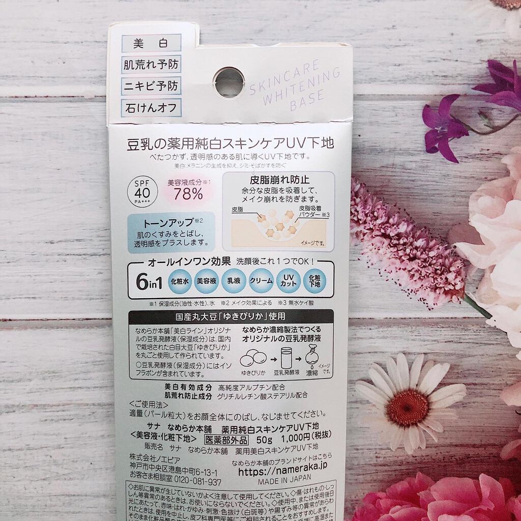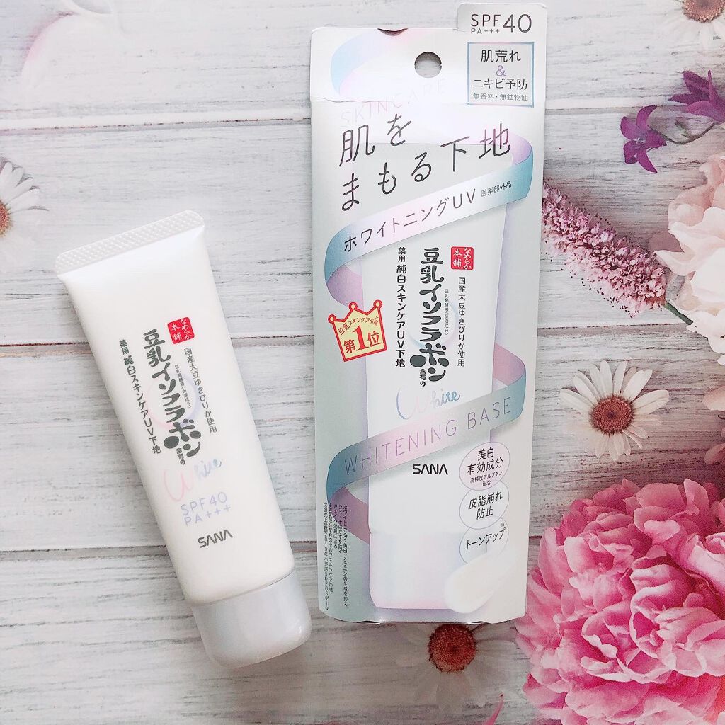 - <薬用美白スキンケアUV下地> 豆乳の美白スキンケアUV下地。肌荒れ&ニキビ予防しながら美白!メラニンの生成を抑え、シミ・そばかすを防ぎます。トーンアップ(メイク効果による)&皮脂崩れ防止。化粧水・美容液・乳液・クリーム・UVカット・化粧下地の1本6役。SPF40・PA+++。[販売名:サナ なめらか本舗 薬用美白スキンケアUV下地]