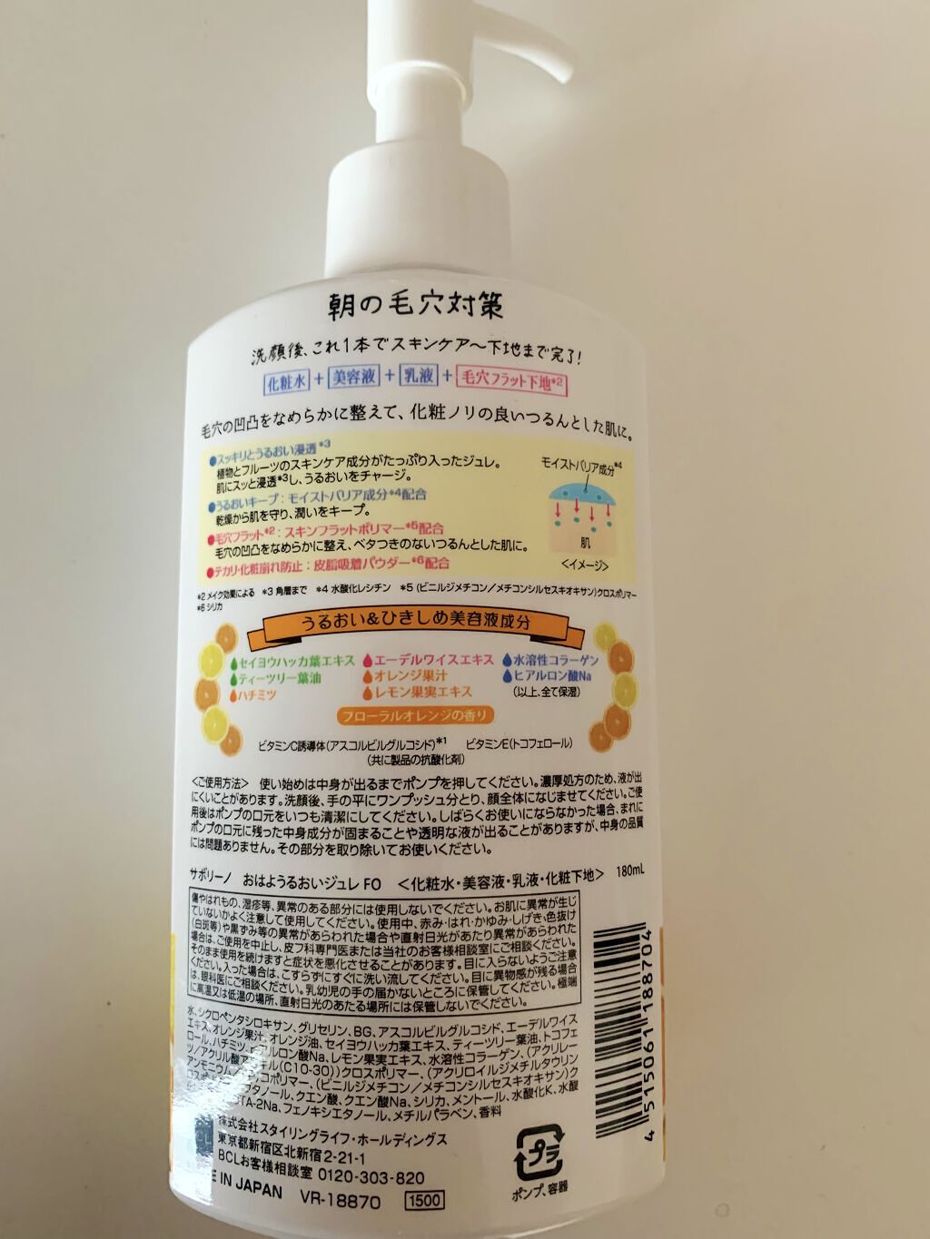 - 朝の毛穴対策オールインワン! 化粧水・美容液・乳液のスキンケア機能と、毛穴フラットの下地※がひとつになったオールインワンジュレ 洗顔後、これ1本でスキンケアから下地まで完了。肌にうるおいを与えながら、毛穴をなめらかに整えて、化粧ノリが良いサラサラ肌に仕立てます。ひんやりメントールで、シャキッとお目覚め効果も。 ◆美容液成分でしっかりうるおう ◆毛穴ケア成分でなめらかサラサラ肌に。すぐにメイクOK! ◆オレンジとホワイトフラワーの爽やかで優しい香り ※メイク効果による