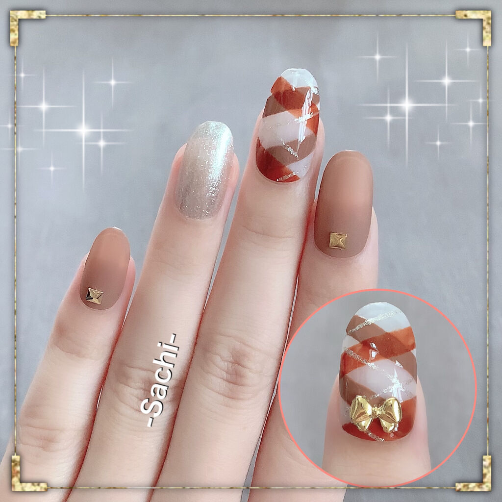 ワンカラーでも指ごとに色を変えるだけでオシャレに見えます💕 画像のようにゴールドラインとストーンを少し足すだけで華やかさがアップ🥰 何度かご紹介したことのあるスポンジで作るグラデーションです✨ スポンジを使うことで境目が綺麗に馴染んでくれます💕 アルミホイルの上でブラウンとトップコートを1:1くらいで混ぜたものを、トップコートのハケに取って3箇所に塗るだけ👌 事前に混ぜたものを塗ることで、爪の上でぼかすより簡単に出来ます💕 ベースカラーが乾く前に点置きしてぼかすことで綺麗にぼかせます✨ スピードが大事なので、使うポリッシュのキャップは全て開けておきましょう😊 天然石のラインはガタガタの方がより天然石っぽく見えるので、ラインを描くのが苦手な方でも大丈夫🙆♀️ 難しそうに見えて、やってみると意外と簡単に出来ます♡