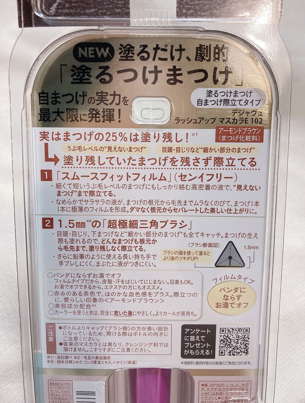 - ロングでもボリュームでもない、「自まつげを際立てる」という新発想 “見えないまつげ”も1本残らず際立てて、目ヂカラを最大限に引き出す 1.うぶ毛レベルの“見えないまつげ”も際立てる「高密着フィルム」 2.あらゆるまつげも1本残らず際立てる「超極細三角ブラシ」