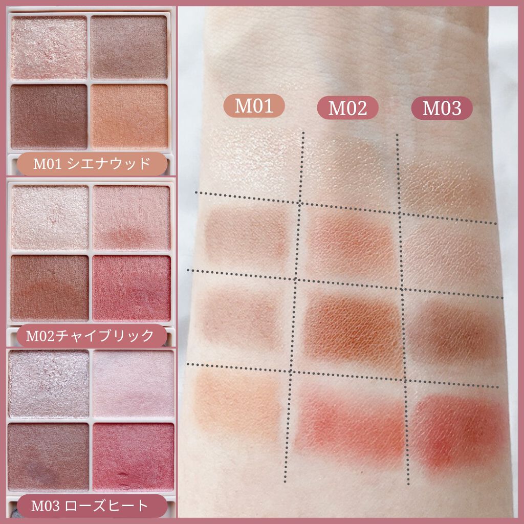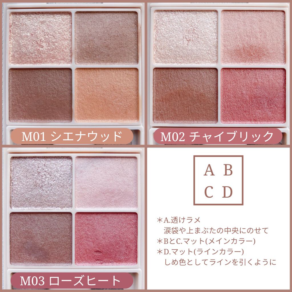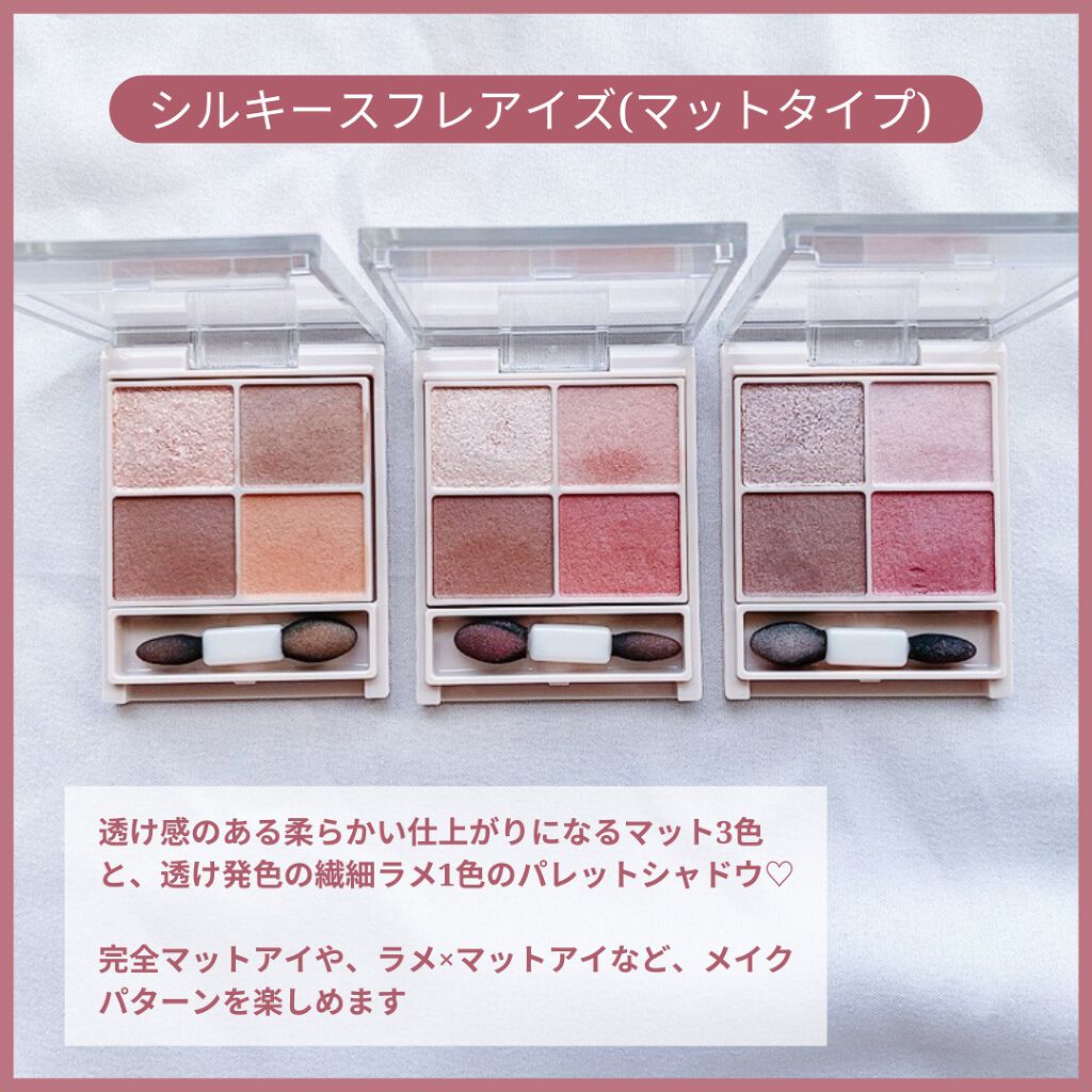 - シルキースフレアイズの姉妹品♡ 肌に溶け込むような透けマットシャドウ 透け感のある柔らかい仕上がりになるマット3色と、透け発色の繊細ラメ1色のパレットシャドウ♡ 完全マットアイや、ラメ×マットアイなど、メイクのパターンを楽しみましょう!