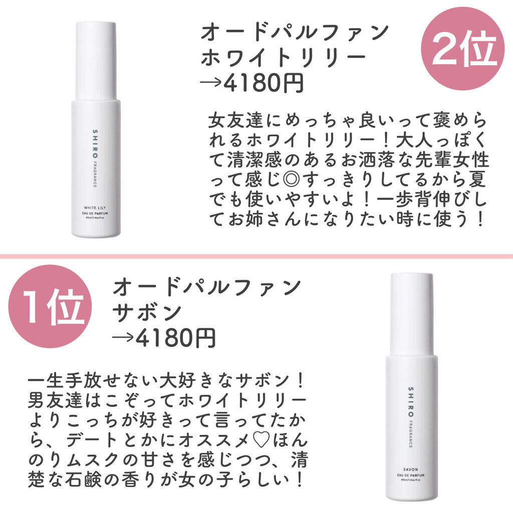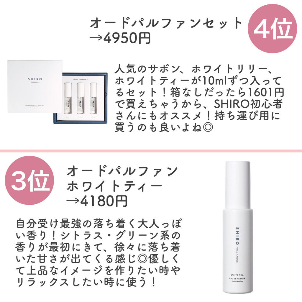 どれもいい香りすぎる!!SHIROの香水レビューです♡𖥣SHIROホワイトリリーオードパルファンSHIROの中ではど定番のホワイトリリー!甘さは控えめで爽やかな香りです。男性も使いやすい香りだと思います!𖥣SHIROホワイトティーオールドパル...