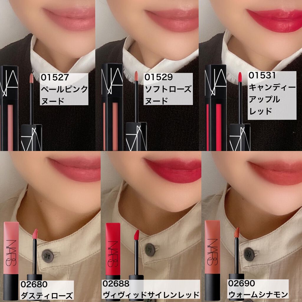 ふんわりなマットリップ💕⚑⚐2020.11.15・#NARS#エアーマットリップカラー・上から31ピンクヌード33ローズヌード37ウォームベージュ39ウォームピンク41ブリックレッド・・写真2枚目に👉指でぼかした色を写...