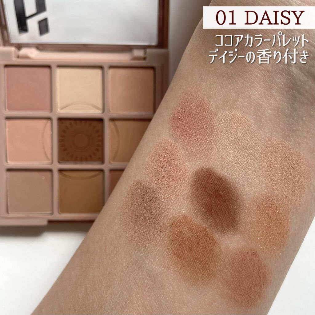マット、シマー、グリッターがセットされた9色パレット♡ ほんのり赤みを感じるパレットでニュートラルなカラー配色だと思います。秋冬にぴったりな色みになっていて可愛いです♡ マットはサラサラで粒子が細かい粉質。 シマー、グリッターは小粒で繊細な輝きなので普段も使いやすいです♡ ローズアンドサンダルウッドの香り付きなので好みは分かれそう…