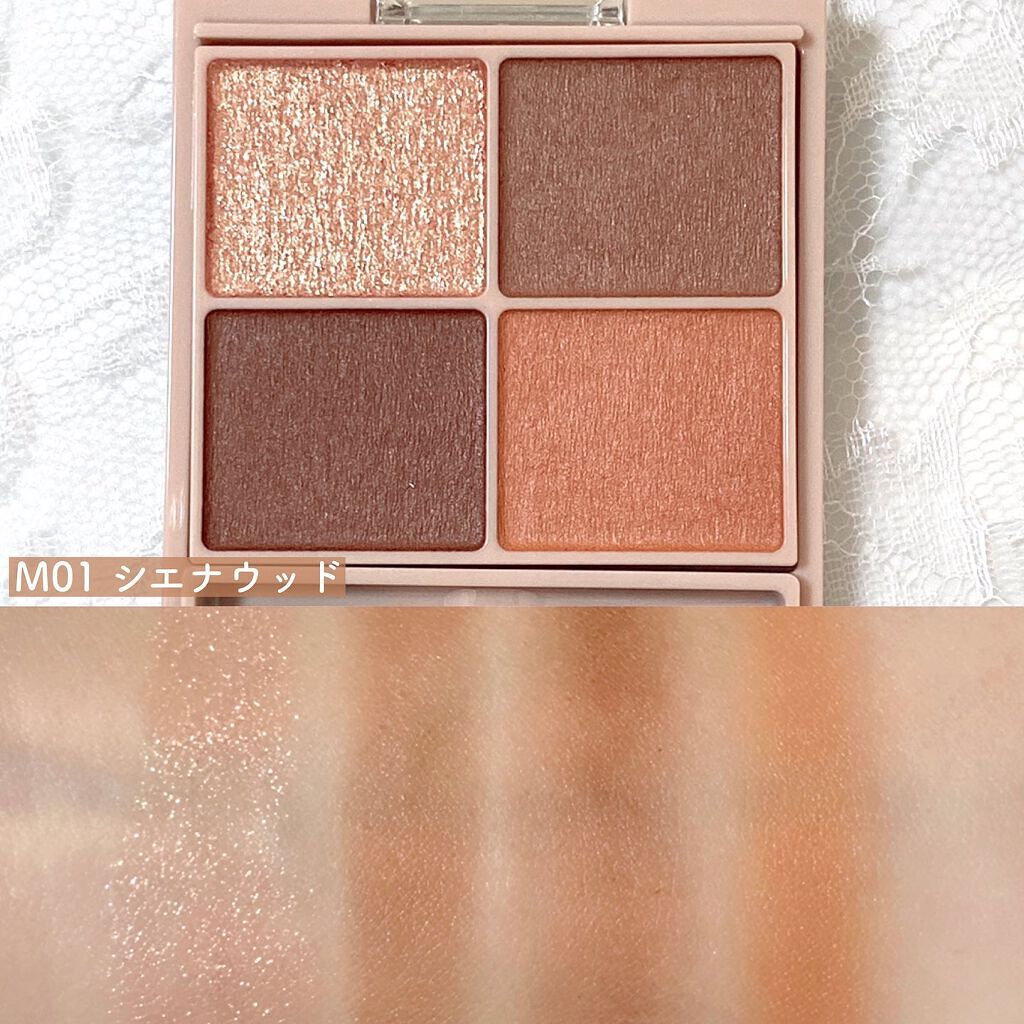 - シルキースフレアイズの姉妹品♡ 肌に溶け込むような透けマットシャドウ 透け感のある柔らかい仕上がりになるマット3色と、透け発色の繊細ラメ1色のパレットシャドウ♡ 完全マットアイや、ラメ×マットアイなど、メイクのパターンを楽しみましょう!