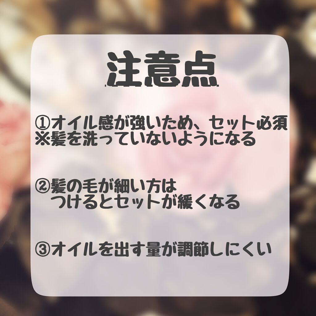 | ヘアケア・スタイリングランキング第23位 | さらっとした扱いやすいオイル ! ドライヤーの前に使うのはもちろん、乾いた髪につけてもベタつかなくてすごい! | 詳細を見る | |