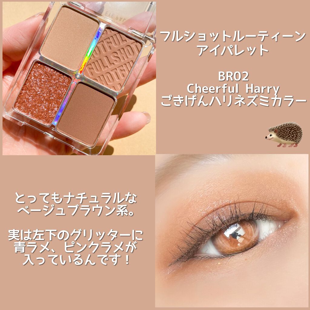 - 3つの異なる質感をレイヤードすることにより印象を自由自在に変身させる「アピュー フルショット ルーティーン アイパレット」ベースカラー、メインカラー、ラインカラー、ポイントカラーを組み合わせることにより、毎日のアイメイクを楽しく彩ります。美容保湿成分カカオエキスやヤシ油を配合し、高密着で色持ちの良い、やわらかな粉質が特徴。宝石パウダー配合のグリッターを組み合わせることで奥行きのきらめきに。