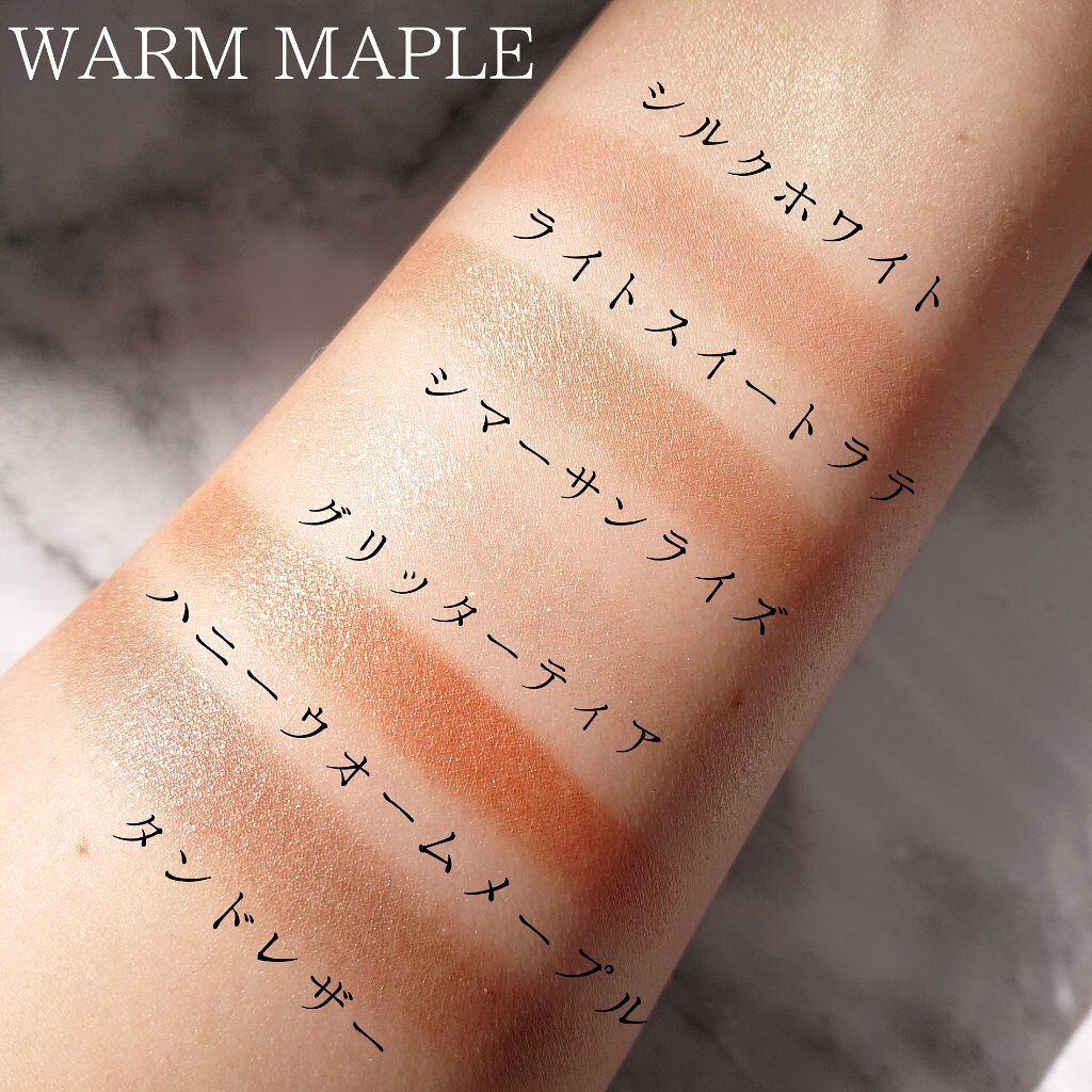 - 【レッドペア】 マイカ、タルク、トリ(カプリル/カプリン酸)グリセリル、フェニルトリメチコン、合成フルオロフロゴパイト、ポリメタクリル酸メチル、シクロペンタシロキサン、ジメチコン、ワセリン、テトライソステアリン酸ペンタエリスリチル、トリメチルシロキシケイ酸、フェノキシエタノール、エチルヘキシルグリセリン、イソドデカン、ステアリン酸Mg、酸化スズ、酸化鉄、酸化チタン、赤202、赤226、黄5 【バーンオレンジ】 マイカ、タルク、ホウケイ酸(Ca/チタン)、トリ(カプリル/カプリン酸)グリセリル、ジメチコン、フェニルトリメチコン、合成フルオロフロゴパイト、ポリメタクリル酸メチル、リンゴ酸ジイソステアリル、シクロペンタシロキサン、ポリエチレン、トリメチルシロキシケイ酸、フェノキシエタノール、エチルヘキシルグリセリン、ステアリン酸亜鉛、ジメチコンクロスポリマー、イソドデカン、酸化スズ、酸化鉄、酸化チタン、赤226、黄5、赤202 【ローズピーチ】 マイカ、タルク、ホウケイ酸(Ca/チタン)、ジメチコン、合成フルオロフロゴパイト、リンゴ酸ジイソステアリル、ポリメタクリル酸メチル、ワセリン、テトライソステアリン酸ペンタエリスリチル、ナイロンー12、ポリエチレン、ステアリン酸亜鉛、ステアリン酸Mg、ジメチコンクロスポリマー、フェノキシエタノール、エチルヘキシルグリセリン、フェニルトリメチコン、酸化スズ、シクロペンタシロキサン、トリメチルシロキシケイ酸、イソドデカン、酸化チタン、酸化鉄、黄5、赤202、赤226 【ゴールデンマンゴー】 マイカ、タルク、ホウケイ酸(Ca/チタン)、ジメチコン、酸化亜鉛、フェニルトリメチコン、テトライソステアリン酸ペンタエリスリチル、シクロペンタシロキサン、リンゴ酸ジイソステアリル、ジメチコンクロスポリマー、フェノキシエタノール、シリカ、ナイロンー12、エチルヘキシルグリセリン、ワセリン、ステアリン酸Mg、ポリエチレン、ステアリン酸亜鉛、トリメチルシロキシケイ酸、イソドデカン、ジメチコノール、酸化スズ、酸化鉄、酸化チタン、黄5、黄4、赤202、赤226 【パープルブラッサム】 マイカ、タルク、合成フルオロフロゴパイト、トリ(カプリル/カプリン酸)グリセリル、ビスジグリセリルポリアシルアジペート-2、水添ポリデセン、ワセリン、テトライソステアリン酸ペンタエリスリチル、イソドデカン、リンゴ酸ジイソステアリル、ステアリン酸Mg、フェニルトリメチコン、フェノキシエタノール、エチルヘキシルグリセリン、トリメチルシロキシケイ酸、ジメチコノール、ミネラルオイル、ポリイソブテン、シクロペンタシロキサン、ミリスチン酸イソプロピル、シリカ、ポリエチレン、(C30-50)アルコール、酸化スズ、パラフィン、酸化鉄、酸化チタン、赤202、グンジョウ、マンガンバイオレット、黄5、赤226、赤104(1)、青1 【ブラウンティー】 マイカ、タルク、合成フルオロフロゴパイト、ジメチコン、ワセリン、テトライソステアリン酸ペンタエリスリチル、ホウケイ酸(Ca/チタン)、ポリメタクリル酸メチル、ステアリン酸Mg、イソドデカン、リンゴ酸ジイソステアリル、フェニルトリメチコン、フェノキシエタノール、エチルヘキシルグリセリン、ポリイソブテン、ステアリン酸亜鉛、ジメチコノール、ジメチコンクロスポリマー、シクロペンタシロキサン、トリメチルシロキシケイ酸、酸化スズ、酸化鉄、酸化チタン、赤226、赤202 【コットンローズ】 マイカ、タルク、合成フルオロフロゴパイト、ジメチコン、ステアリン酸Mg、テトライソステアリン酸ペンタエリスリチル、ワセリン、ポリメタクリル酸メチル、水添ポリデセン、ビスジグリセリルポリアシルアジペート-2、シリカ、ナイロンー12、ミネラルオイル、メタクリル酸メチルクロスポリマー、リンゴ酸ジイソステアリル、ミリスチン酸イソプロピル、ホウケイ酸(Ca/チタン)、エチルヘキシルグリセリン、フェノキシエタノール、イソドデカン、水、フェニルトリメチコン、ポリイソブテン、ジメチコノール、シクロペンタシロキサン、トリメチルシロキシケイ酸、ポリエチレン、酸化スズ、(C30-50)アルコール、パラフィン、ヒアルロン酸、酸化チタン、酸化鉄、赤226、赤202、黄5 【ウォームメイプル】 マイカ、タルク、ジメチコン、ホウケイ酸(Ca/チタン)、ステアリン酸Mg、テトライソステアリン酸ペンタエリスリチル、ポリメタクリル酸メチル、ワセリン、リンゴ酸ジイソステアリル、シリカ、ナイロンー12、フェノキシエタノール、エチルヘキシルグリセリン、シクロペンタシロキサン、ポリエチレン、ステアリン酸亜鉛、ジメチコンクロスポリマー、ジメチコノール、酸化スズ、酸化亜鉛、酸化鉄、酸化チタン、赤226 【ブルーファア】 マイカ、タルク、ホウケイ酸(Ca/チタン)、ナイロン-12、合成フルオロフロゴパイト、オクチルドデカノール、ステアリン酸Mg、リンゴ酸ジイソステアリル、メチコン、ステアロイルオキシステアリ