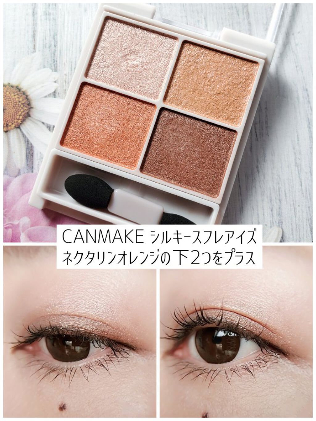 可愛い色味で、こういうカラーバランスのパレットは持っていなかったので見た目で選びました。 ほんわかした可愛らしいピンクとオレンジに、シルバーのニュアンスをプラス。うるっとした目元を演出する抜け感パレット。