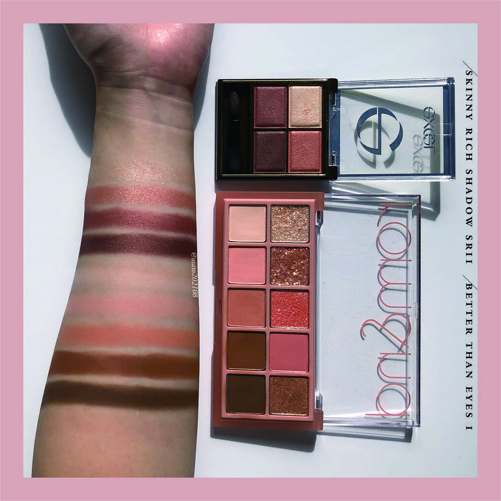 値段もお手頃で、誰にでも似合いやすく失敗しにくいので、プレゼントや韓国コスメ初心者の方にもおすすめです。 粉質は柔らかく、ラメは繊細かつ密着度が高く、中身の質も更にグレードアップしております! 02のロージーヘイズは、ロムアンド ベターザンアイズ02ドライローズと似ているというかほぼ同じ色でした。 私はイエベ秋かつ青みが特に苦手と診断されましたが、黄みもあるせいか比較的馴染んでくれます。 黄みが苦手な方の場合、メインカラーを避ければ使いやすいかと思います。 落ち着きのあるカラーで、秋にぴったりです。