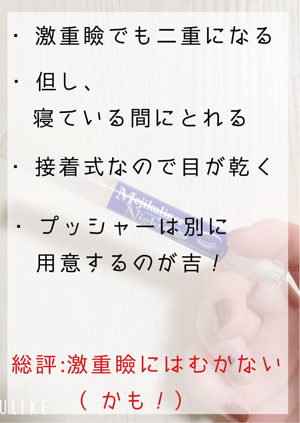 シェモアメジカライナーナイト&ハードプッシャー不要のスパチュラタイプだから不器用さんも簡単だし面倒くさくないです。二重だけど浮腫んだ時や三重になった時に使ってますが目がくぼんでるので今まで他のやつだとやりづらかったですが、これはカチカチっと後...