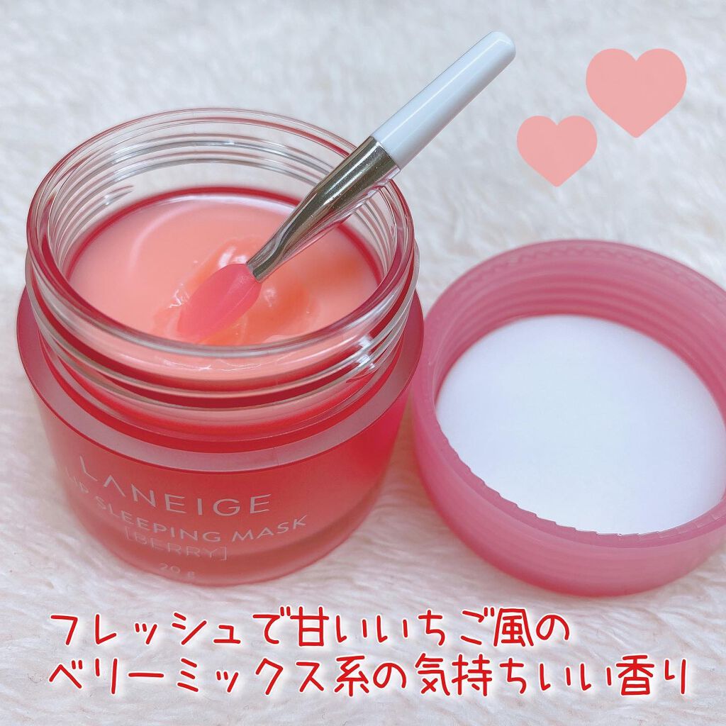 - 寝ている間にケアしてふっくらぷるぷるにうるおった唇へ。 2015年の初代発売以降、世界で2秒に1個売れている*¹LANEIGE大ヒットシリーズ *¹ 2024年グローバル販売実績 1.角質にアプローチするBerryFruitComplex (ベリーフルーツコンプレックス)*²が、 寝ている間に気になる乾燥や角質にうるおいを与え、つやのあるふっくらとうるおった唇に仕上げます。 *²ザクロ果実エキス、ブドウ果実エキス、ラズベリー果実エキス 2.ココナッツオイル(ヤシ油)を配合で、うるおいをあたえ睡眠中の乾燥を防ぎます。 3.今夜はどんな気分?5つのフレーバーから選べるワクワク感。 ■テクスチャー:やさしく馴染むなめらかなバームタイプ ■アレルギーテスト済み*³ *³全ての方にアレルギーが起こらないということではありません。 ■使用方法 寝る前に唇にたっぷり塗り、そのままお休みください。 翌朝、軽くティッシュオフします。付属のスパチュラで塗ることで、より唇の角質に馴染みやすくなります。 日中のリップトリートメントにも使用できます。
