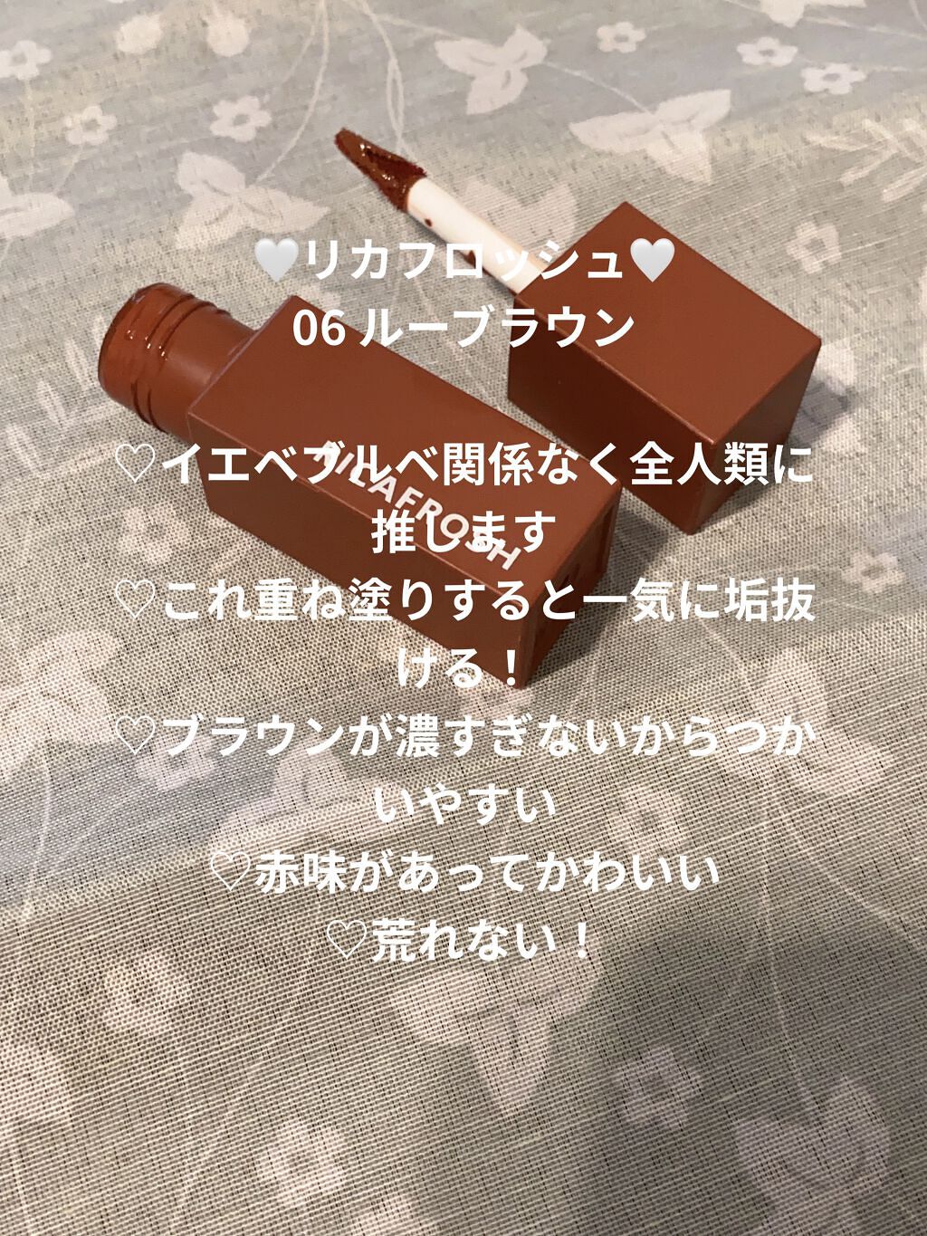【私の人生リップ💄💖】【使った商品】RICAFROSHジューシーリブティント【色もち】1度ティッシュオフ→もう一度塗るこれで全く落ちない(ー̀֊ー́)✧【質感】クリームみたいロムアンドのようにみずみずしさはないテクスチャだけど、広げやすい🙆...