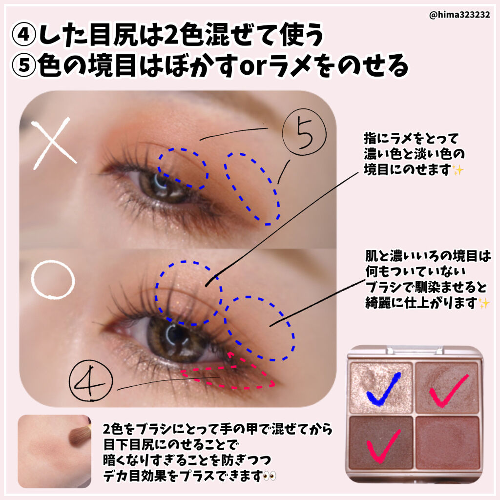 ①指でベタ塗りしない ②濃い色を広く入れすぎない ③目頭側に広く色を入れない ④下目尻は2色混ぜて使う ⑤色の境目はぼかすorラメをのせる ⑥涙袋の影は入れすぎない ⑦涙袋にラメを乗せすぎない ⑧マスカラ・グリッターはつける量を調節する ⑨マスカラのダマはコームでとかす ⑩アイラインは目尻だけ