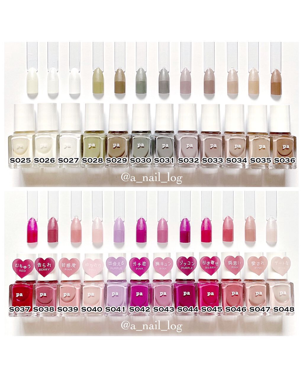 S品番はシアーな液質なので 一度塗りだと透け感のある仕上がりに、 二度塗りするとしっかり発色します✨ カラーチャートは 自爪(3〜4枚目)は二度塗り、 スティック(6〜8枚目)は 上部一度塗り、下部二度塗りしています💅🏻 【pa nail ベーシックネイルS】 6ml / ¥330(税込)