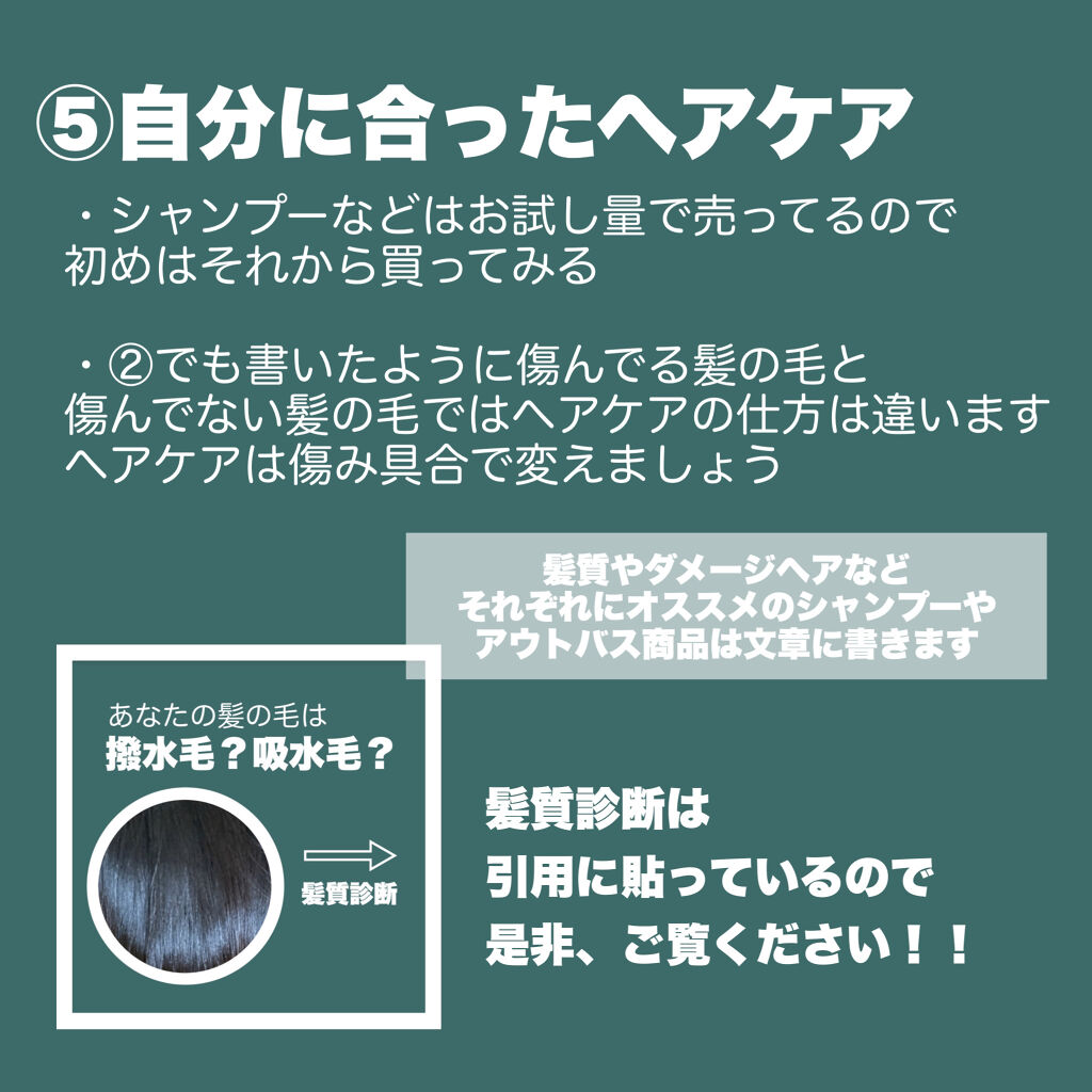 自分の髪質を知って正しいケアでさらに美しい髪に目指しましょう✨ 肌ラボ の極潤ヒアルロン液ハダラボモイスト化粧水dベタつかないし頭皮に付いても大丈夫!! エッセンシャル の CCオイル軽めのオイルだから撥水毛にはオススメ◎ モロッカンオイルモロッカンオイル トリートメントフワッと香る 甘めの匂いがお気に入りです! フィーノプレミアムタッチ 浸透美容液ヘアオイルしっとりするけど軽い付け心地って感じ &honey&honey Melty モイストリペア ヘアオイル 3.0かなりしっとりするイメージ!!