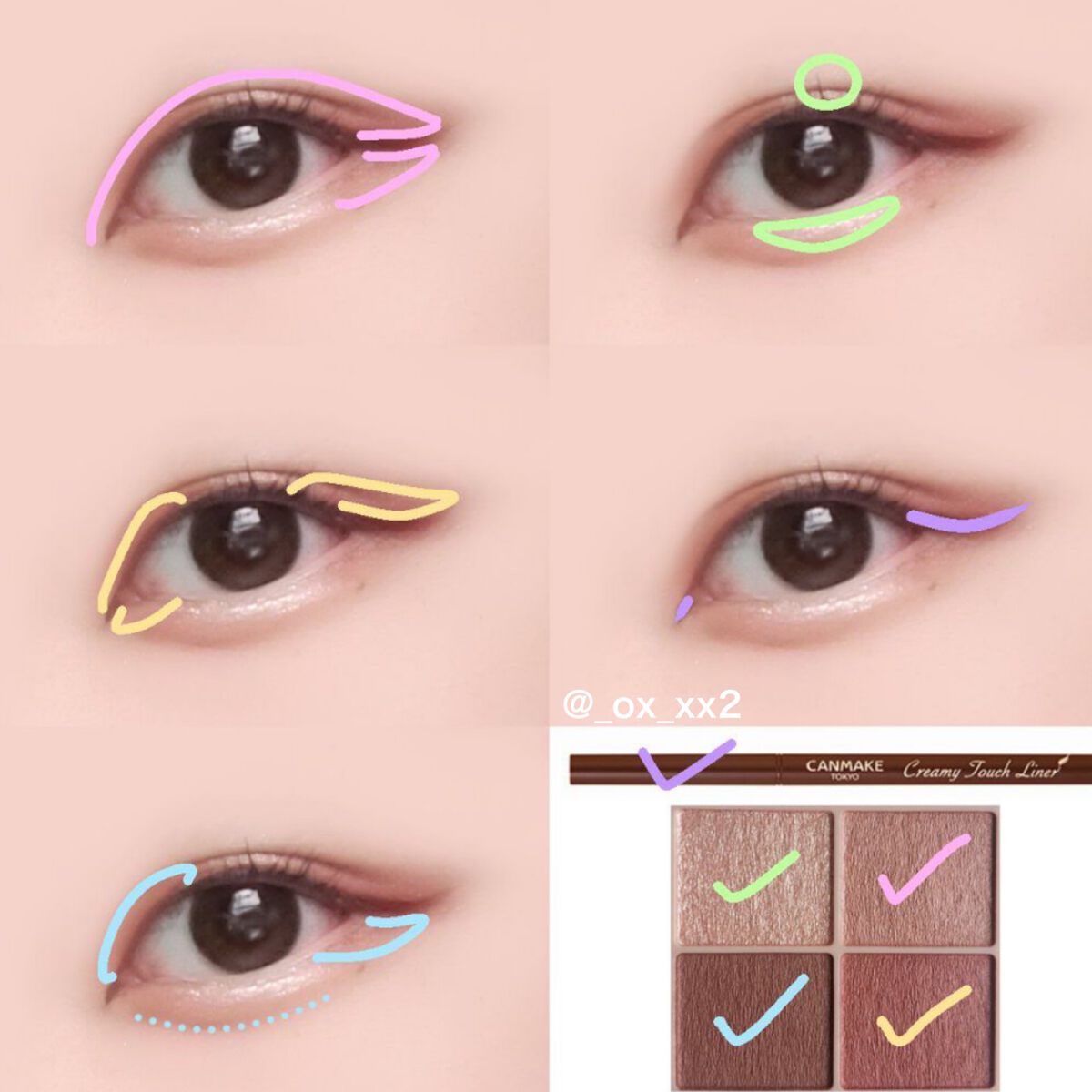 💗ベースカラーを全体にのせる💗 薄めのカラーがオススメです! 🍊二重幅にグラデーションになるようにのせる🍊 目の縦幅を出すためにグラデにします! 🍇アイライナーを長めに引く🍇 上目頭と上目尻に引く、目の横幅を出すためです!