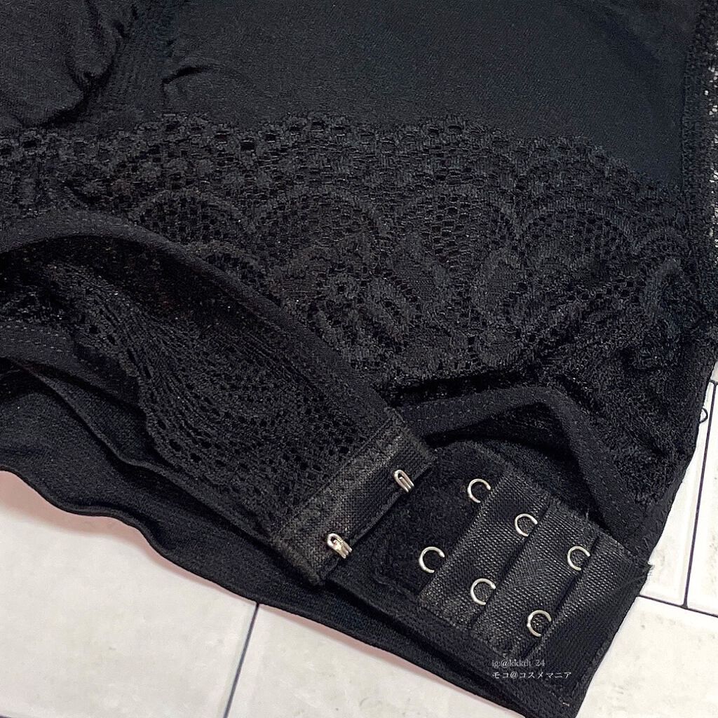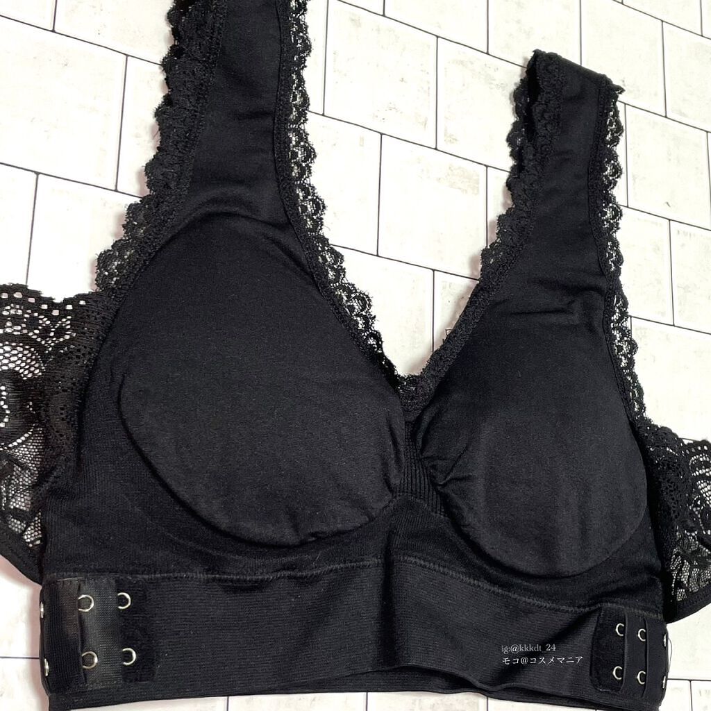 こちらのナイトブラの特徴としてはクロスストラップ構造で右のバストは左上へ、左のバストは右上へ寄せ上げて睡眠中もバストを正しい位置にキープしてくれます。 所々にレースがあしらわれていて見た目も可愛いのも嬉しいポイントです😁 ホック位置が左右脇下にある珍しい構造だなと思います。 アンダーバスト部分もキツ過ぎず、でも緩くなくしっかりバストを支えてくれている感じがあります🎶 脇下が幅広になっていることでホールド感もしっかりしていますし横にお肉が流れるという感じもありません😍 肩紐が幅広で柔らかい素材なので肩もとても楽です。 付けていてとても楽ですし苦しくないのでナイトブラとしてだけでなく日常的にも使用したいなと思う付け心地です✨ 胸もしっかり綺麗に見えますし、グッと上げてくれているのが分かるのが付けていてとても心地よいです😊