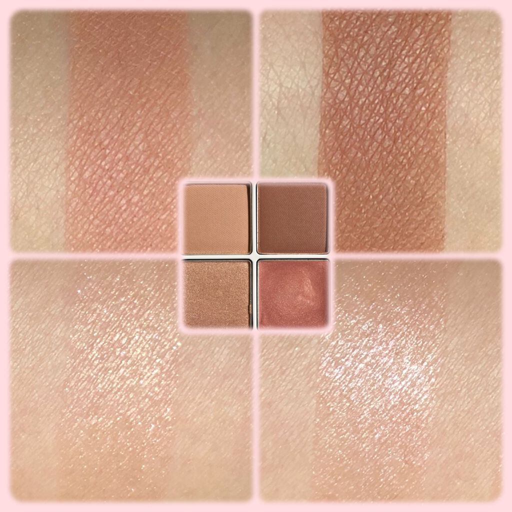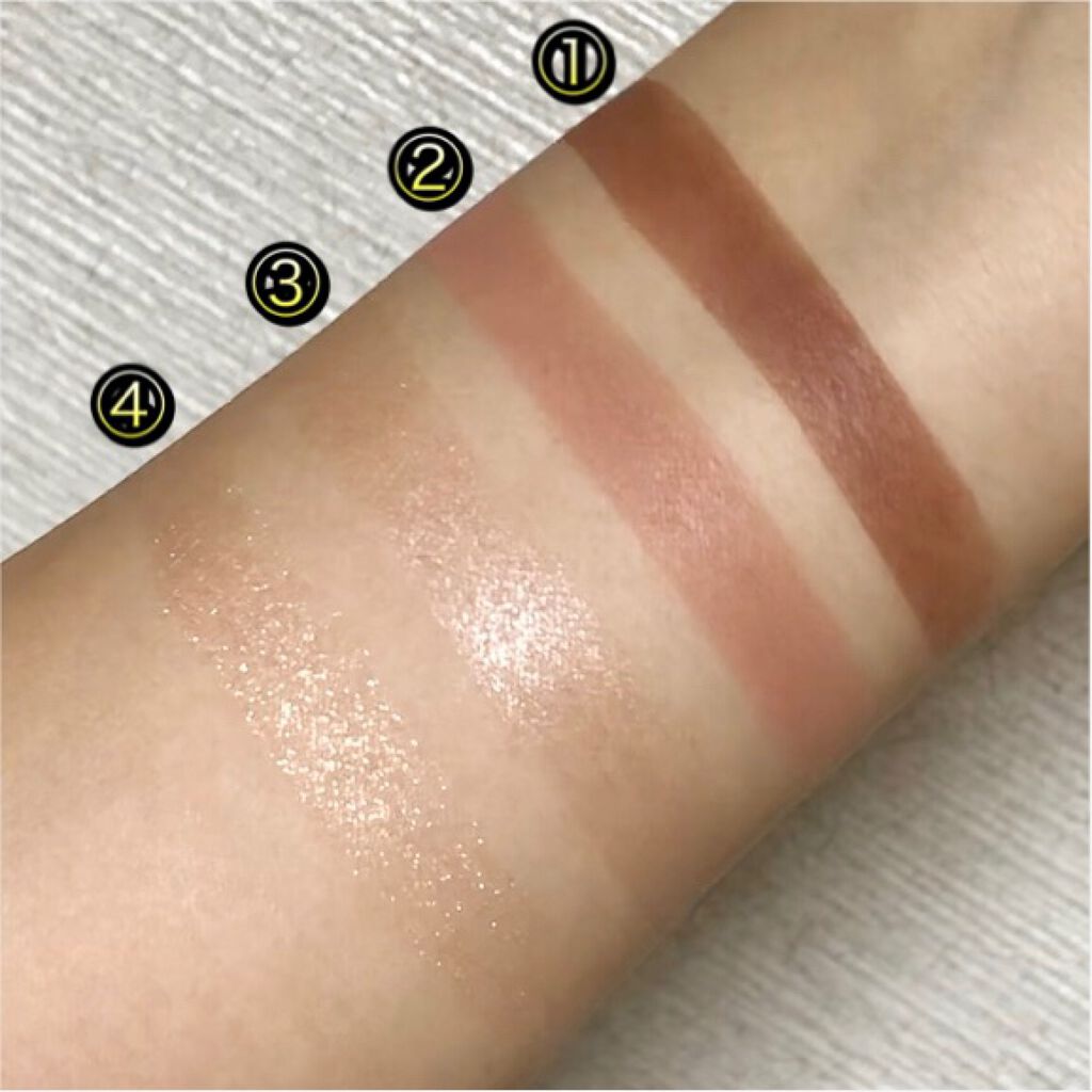 全体的には、名前のとおりヌーディーな印象☺️定番色「01 本命のブラウン」と似てるんだけど、今回の「104 本能のヌードベージュ」の方が、よりヌーディーなカラーとなっておりまする💁🏻♀️ 左上のベージュカラー(1番)は、基本的にはマットカラーなんだけど、ほんのりラメも入ってるから、のっぺりとした印象にならなくて良き🥰 4番のカラーは、ハイライトとして使うこともできるし、個人的には涙袋に使っても良いのではないかと思っておりまする👻 こちらは、全体的にしっとりとしたテクスチャーとなっておりまする💖そして、上2色のマットカラーが、結構しっかり発色してくれます❣️ 右下のハイライトカラーも、「104 本能のヌードベージュ」ほど白っぽくならないので、さりげなくハイライトを入れたい人にピッタリ✨