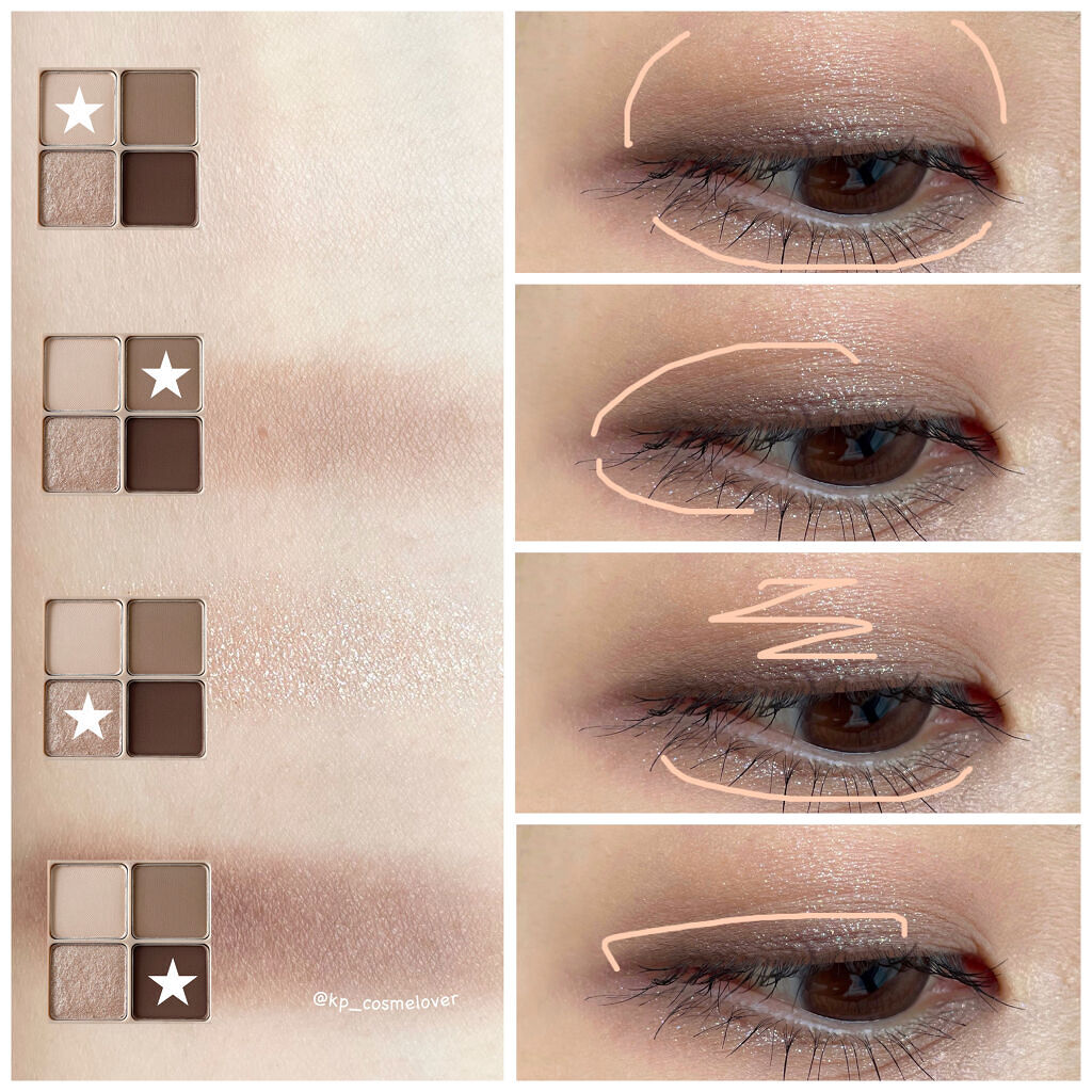 - 可愛いがあふれるドリームシャドウ ①肌に馴染みやすく使いやすい配色 ②クールメイクにピッタリな瞳を演出 ③なめらかで塗り心地の良いマットカラーが立体感を作る ④キラキラと輝く上品なまなざしを作るグリッター