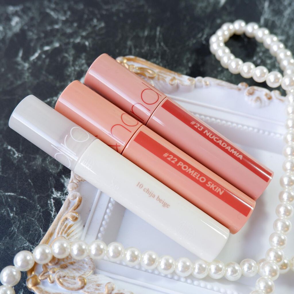 もう説明不要のロムアンドのティントですが、グラスティングウォーターティントの方が肌になじむ透け感のある水膜ティントです💡 10番のチジャベージュは漢服エディションとして発売されたんですが、透け感のあるコーラルベージュで、イエベ春さん絶対好きなやつ… ロムアンドの定番のやつですね。他のカラーも持っているんですが、今回スウォッチした色は発色がパキッとし過ぎてなくて使いやすいです♫