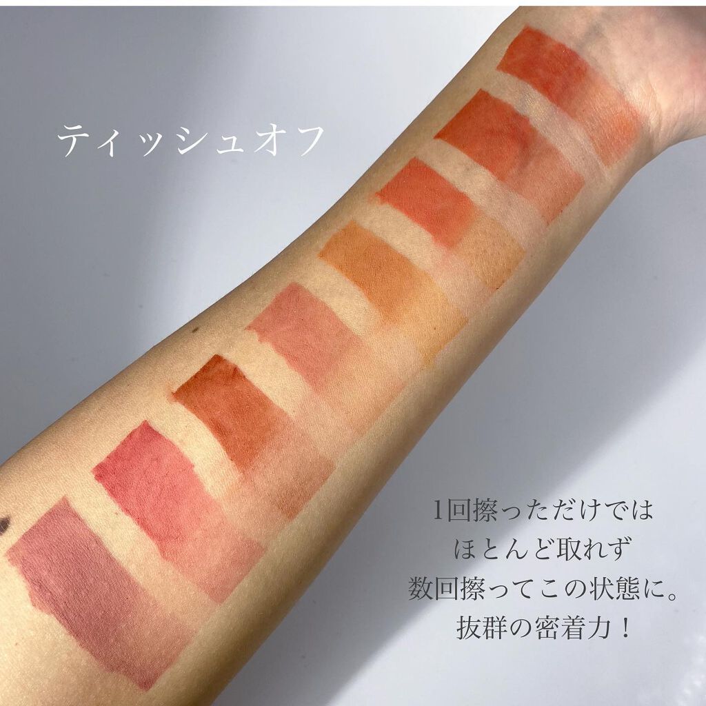 テクスチャーが変化していくティントです! 速乾性があるのですぐにサラサラのマットにテクスチャーが変わっていきソフトマットな仕上がりに。 テクスチャーが変化していく時に水分が蒸発するのと同時に唇へピターっと密着してくれるので食べたり飲んだりしてもほとんど取れない上にマスク付きもかなり少ないです✨ こんなに持ちがいいのにクレンジングでは簡単にするっと落ちて色素沈着もしないので肌への負担も少なそうな点も個人的にはかなりポイント高めです❤️❤️ 06.Soft Walnut ブラウンレッド系で新色の中でも特に深みのある色🍂 07.Cranberry Plum グレーがかったローズでブルベ寄りなカラー。華やかさもありつつ上品さもある色合いでした❤️ 08.Dusty Beige ブルベ大優勝✨ 青みがかったピンクベージュで肌馴染みの良さそうなカラーです!
