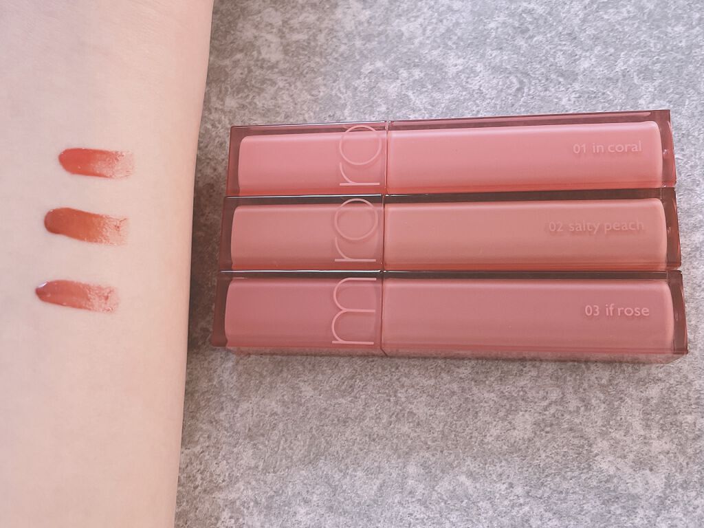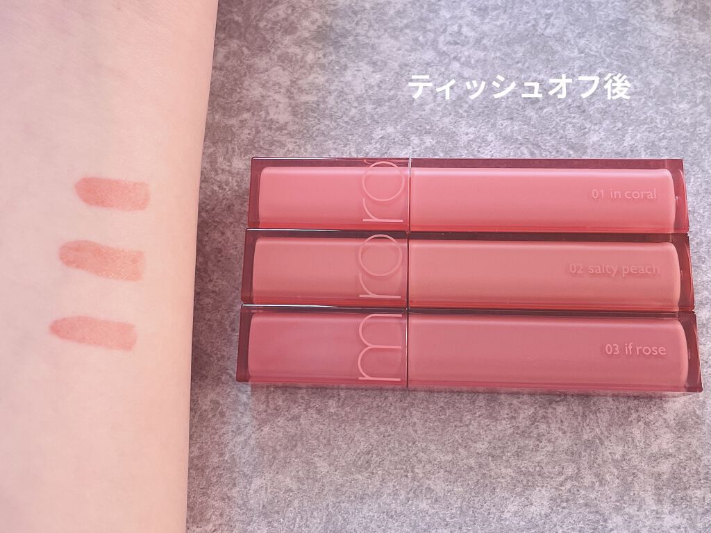 私が購入したのは、01 in coral02 salty peach03 if roseの3本です💄💕 まだ届いたばかりで、試しで塗ってみただけですが、ジューシーラスティングティントより荒れにくいと感じました。もし、ジューシーラスティングティントで荒れたから買う気になれないという方でも1本買ってみてもいいと思います☺️