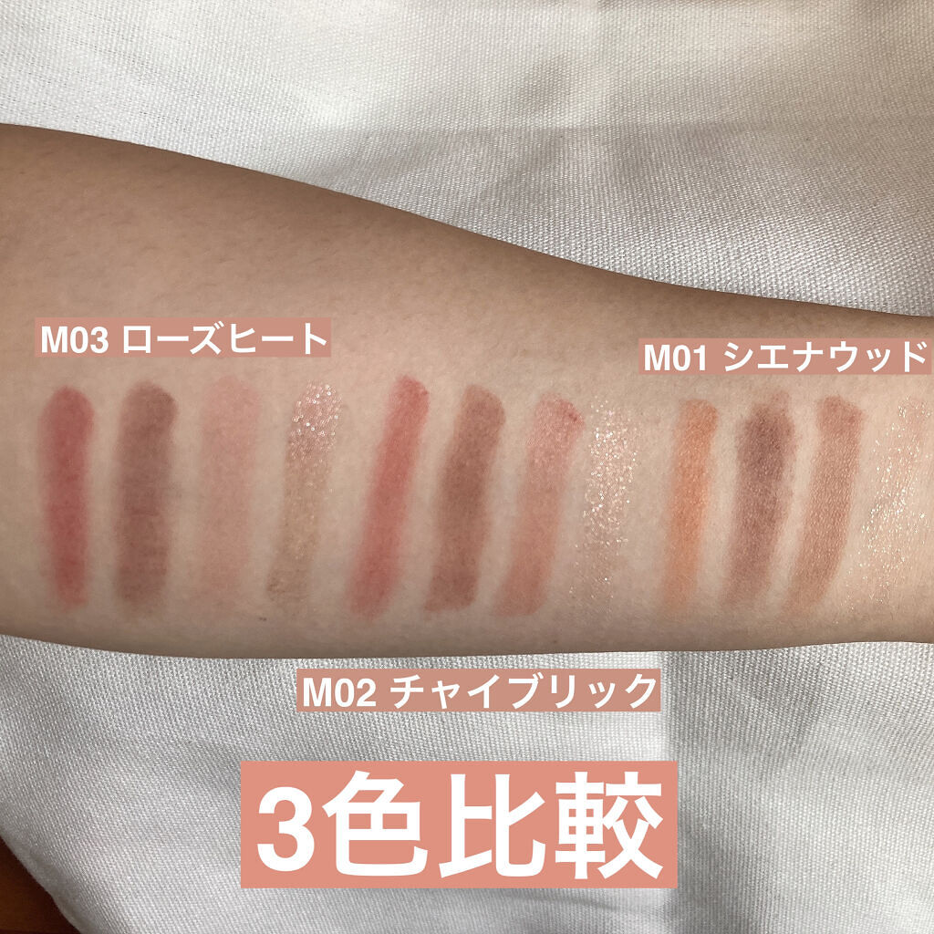 ♡M01 シエナウッド温かみのあるオレンジブラウンオレンジがメインでも、ブラウンがメインでも使える万能パレット🙆🏻♀️ ♡M02 チャイブリックオシャレなピンクテラコッタ3色の中で1番華やかに仕上がります!! ♡M03 ローズヒート青みが強めのローズボルドー02 チャイブリックに青みが足された感じで、とても大人っぽく上品に仕上がります!!