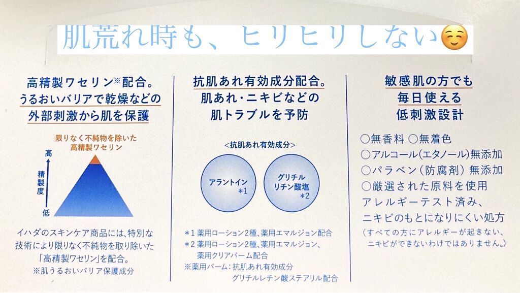 IHADA薬用ローションとてもしっとり,薬用エマルジョンイハダさまからいただきましたイハダ薬用スキンケアは高精製ワセリン※1配合肌荒れ防止有効成分・うるおい成分配合してます。※1肌うるおいバリア保護成分キメを整え、うるおいに満ちた肌に導く「薬...